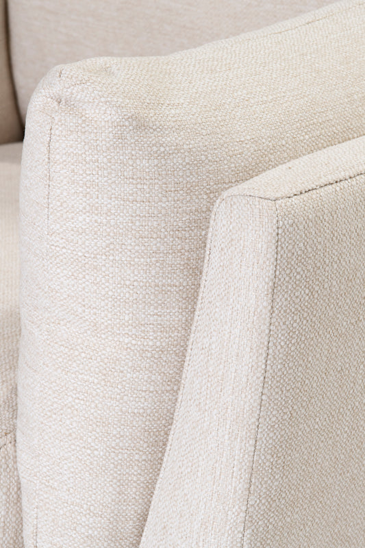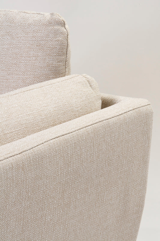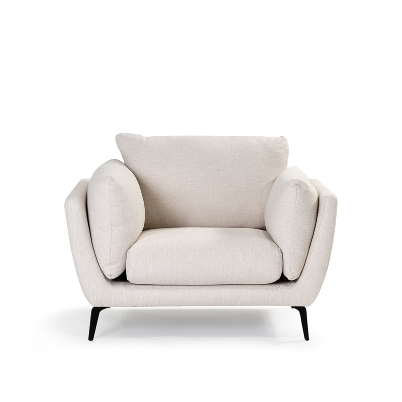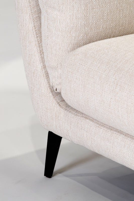 Simple and sleek, the Marc Armchair in oat with black tapered metal legs is an exclusive design for Empire.