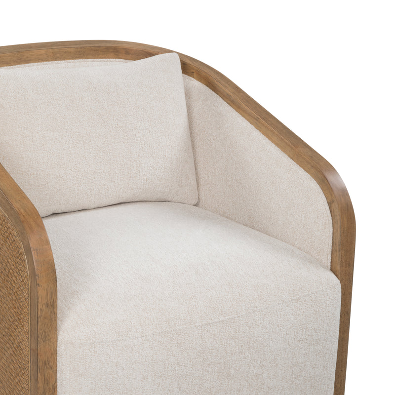 The Margeaux Rattan Armchair blends contemporary comfort with timeless charm. Featuring a curved rattan frame, wooden arms and upholstered seat, blending seamlessly with any interior decor.