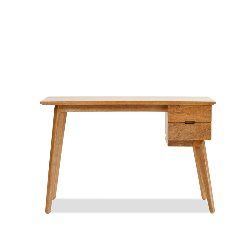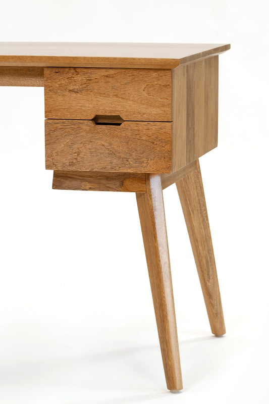 Built from solid mango wood with Natural Sealed finish. This desk has 2 drawers and tapered legs.