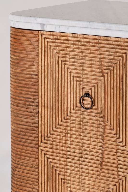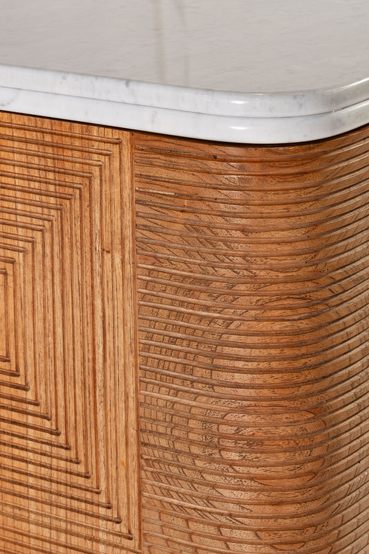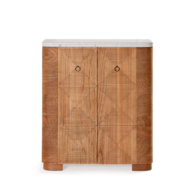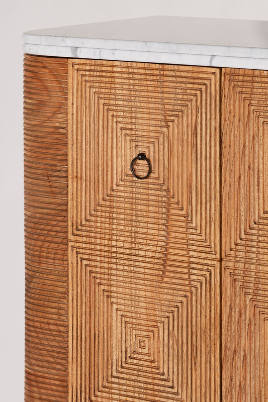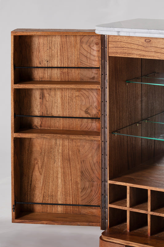 Crafted from solid mindi wood with an antique finish and white marble top, the Martini Cabinet offers versatile storage for glassware and bottles. Featuring glass shelving and door storage to accommodates various heights effortlessly. Complete with a mirrored backing and cellar-style bottle storage, it's designed to meet all your entertaining needs with elegance and functionality.