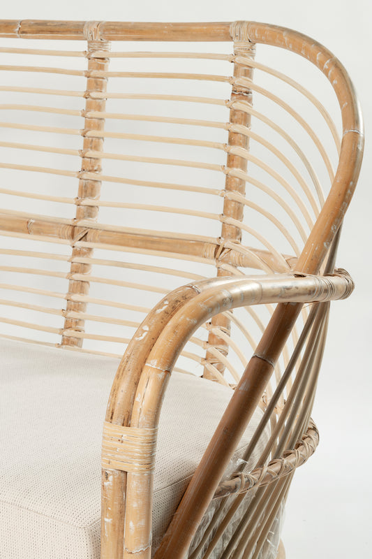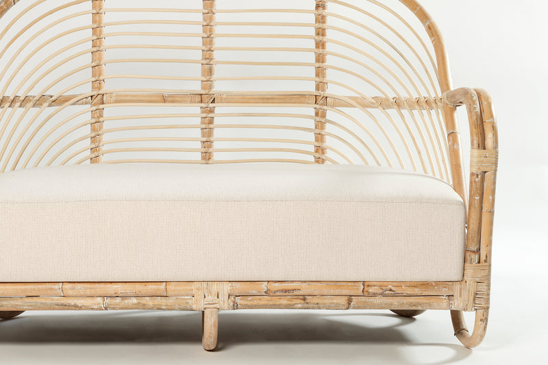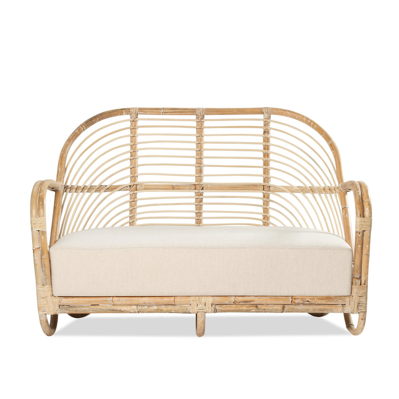 Durable rattan frame sofa with detailed rattan backrest and comfortable fabric cushion seat. Two seat sofa available in multiple colour combinations.