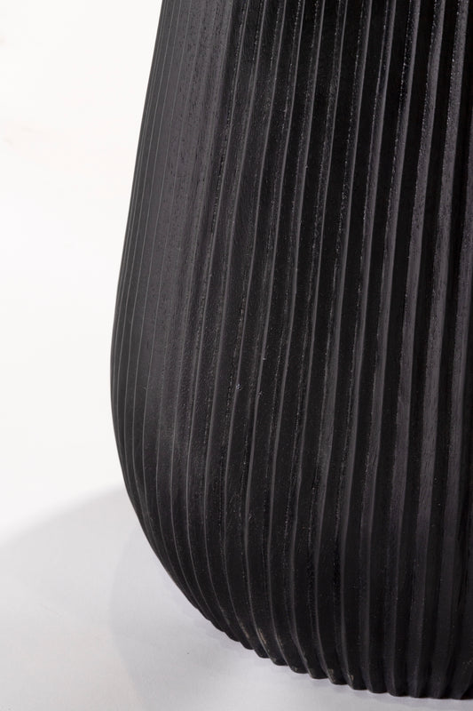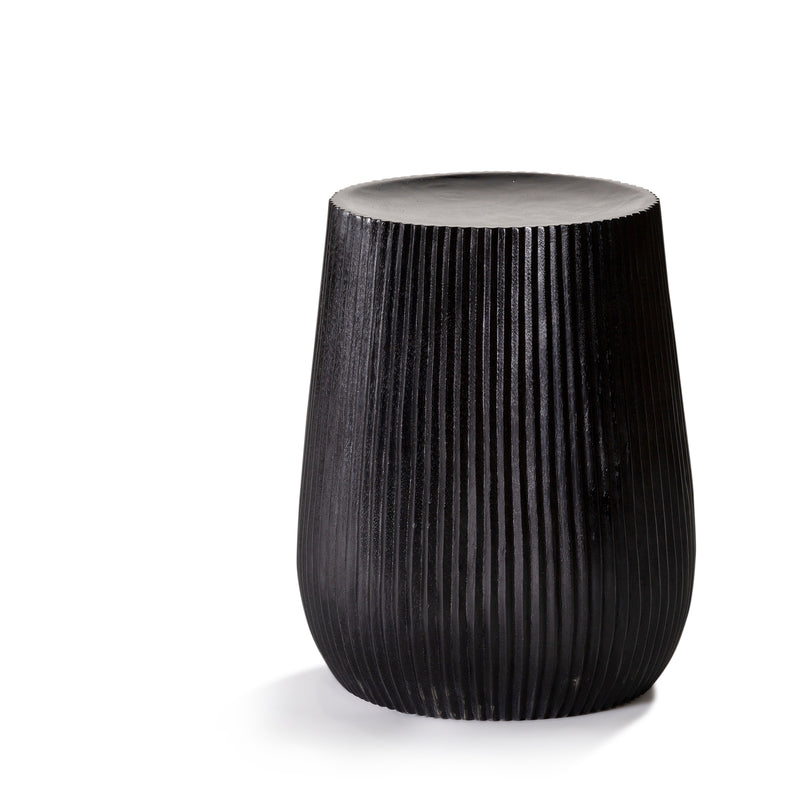 Constructed from raw meh wood with a drum shape and vertical stripe design in ebony finish, this hardwood stool is highly durable. Colours/finishes between items may vary and some slight cracking can occur, due to the natural nature of the timber.