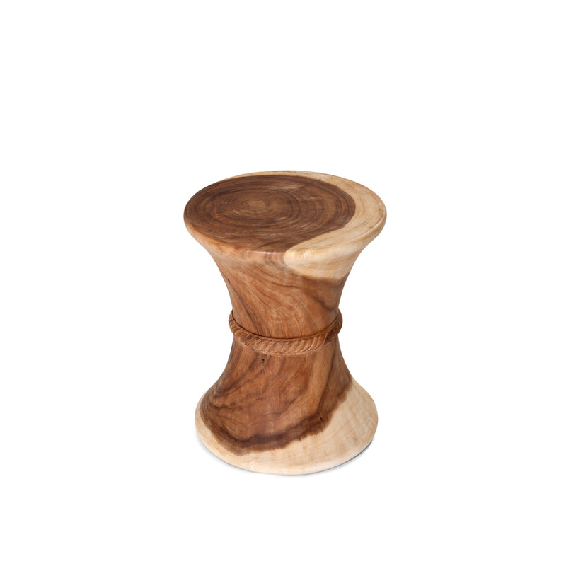 Hourglass stool with carved rope detailing constructed from raw meh wood. This hardwood stool is highly durable. Colours/finishes between items may vary and some slightly cracking can occur, due to the natural nature of the timber.
