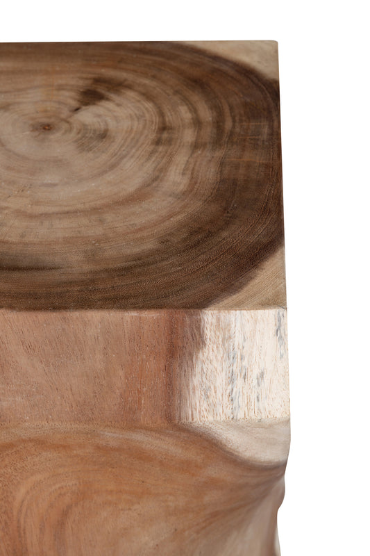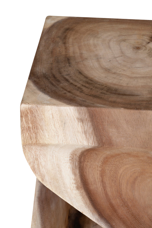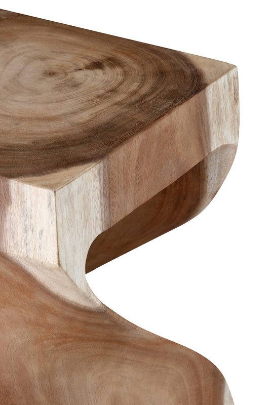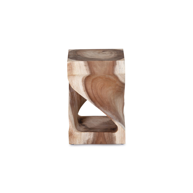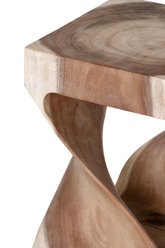 Twisted shape stool constructed from raw meh wood. This hardwood stool is highly durable. Colours/finishes between items may vary and some slightly cracking can occur, due to the natural nature of the timber.