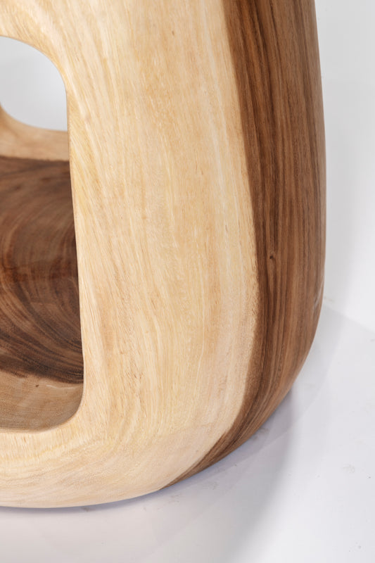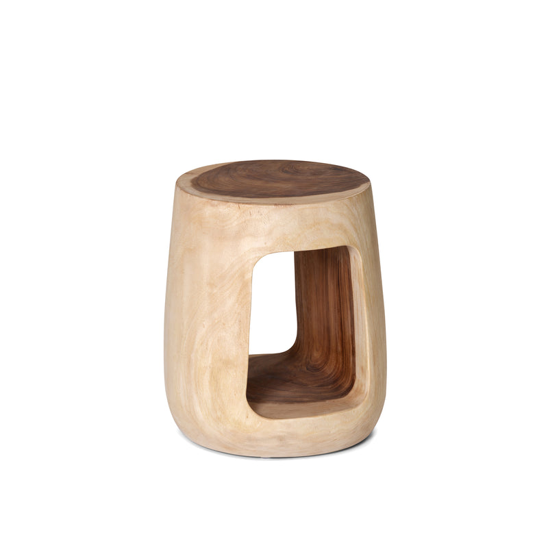 Constructed from raw meh wood with a square cut out detail. This hardwood stool is highly durable. Colours/finishes between items may vary and some slightly cracking can occur, due to the natural nature of the timber.