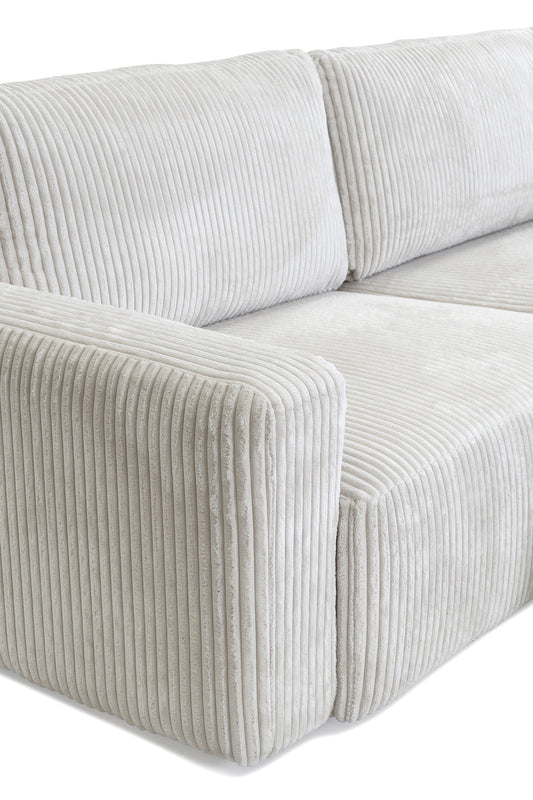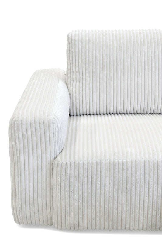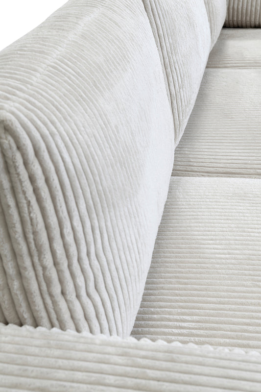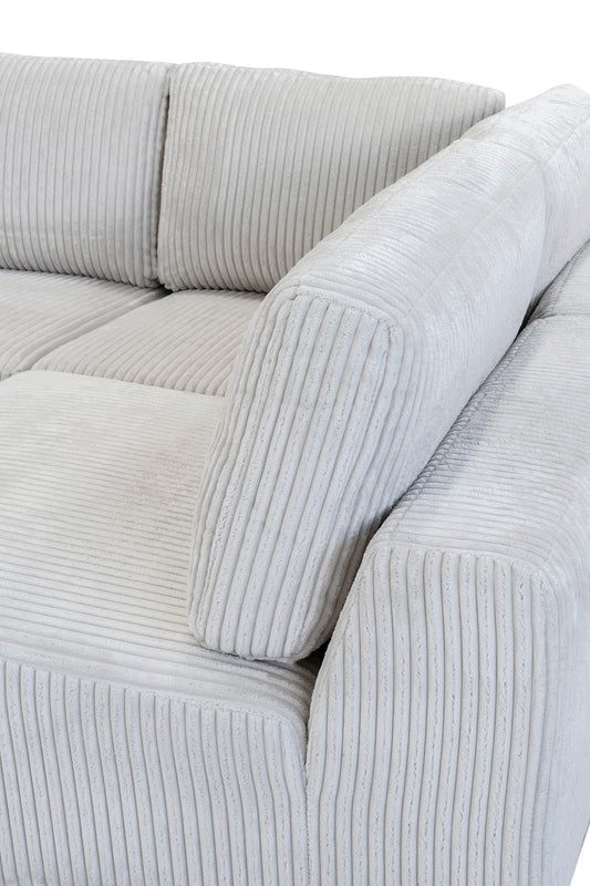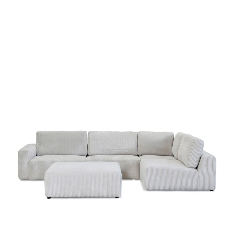 Modern and practical, The Milo sectional sofa offers generous comfort with deep seating and low back design. Upholstered in jumbo cord fabric in cream colour, as 5 separate pieces including large ottoman that can be moved as needed.