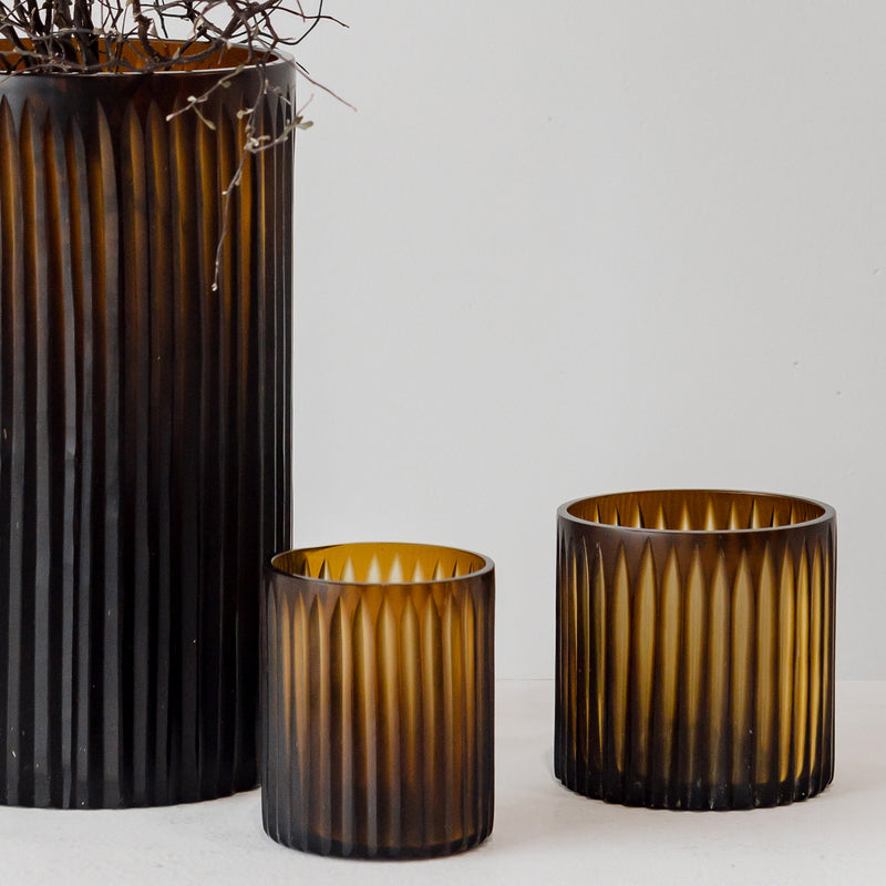 Our modern Mio Votives are perfect to bring modern style to your home. Crafted with fused brown glass, it features vertical textural stripes and straight lines. Enjoy them with your favourite tea lights or floral arrangement.