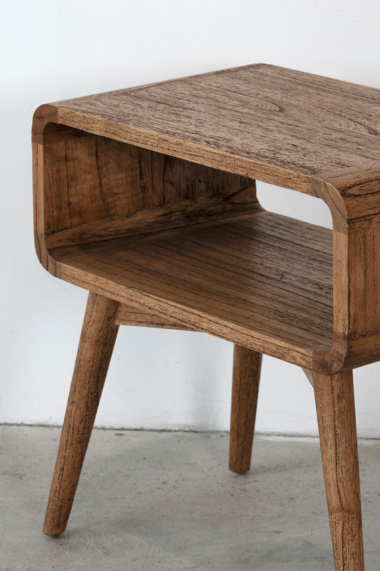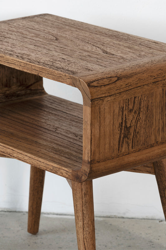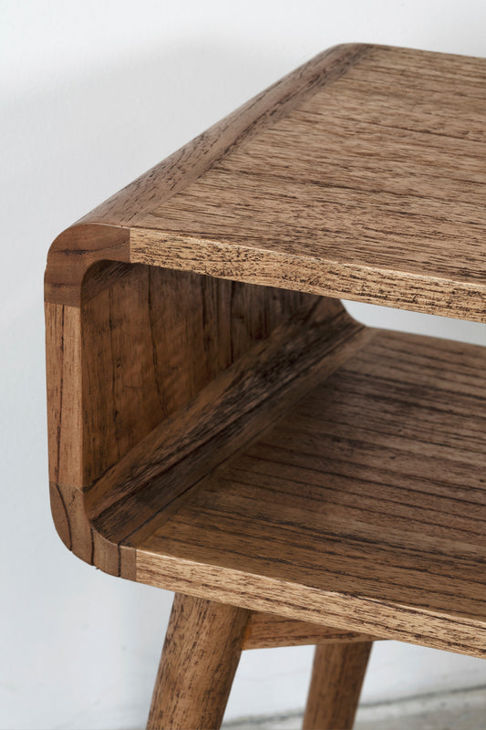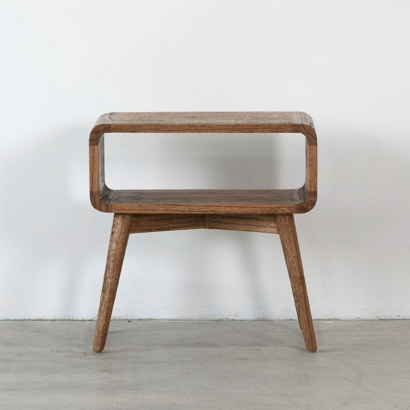 The Modular bedside features a classic rounded design with open storage, simple yet functional. Made from mindi wood in an antique finish.