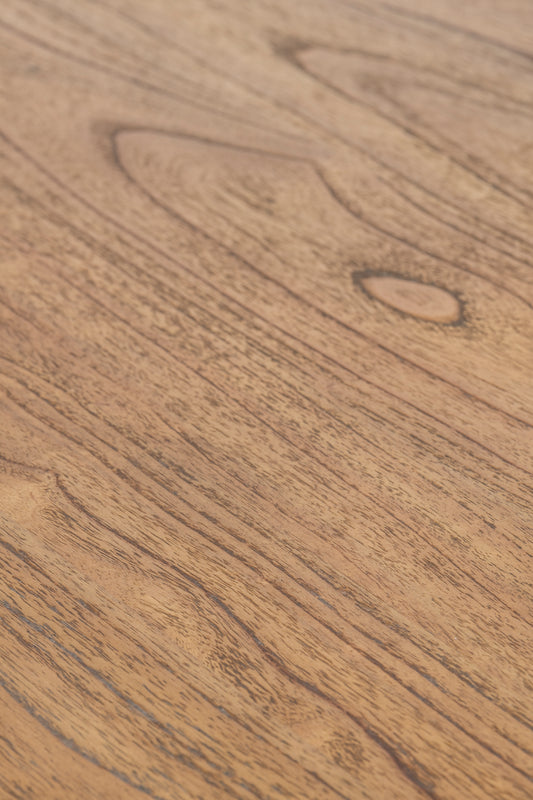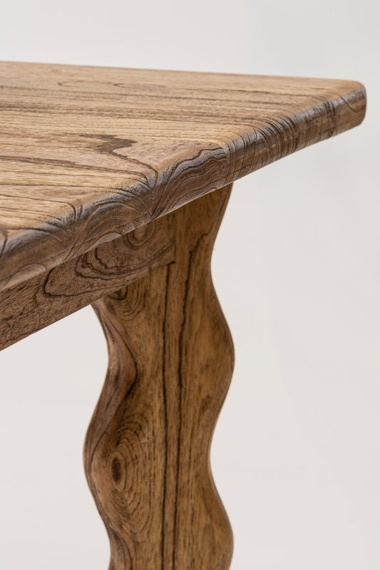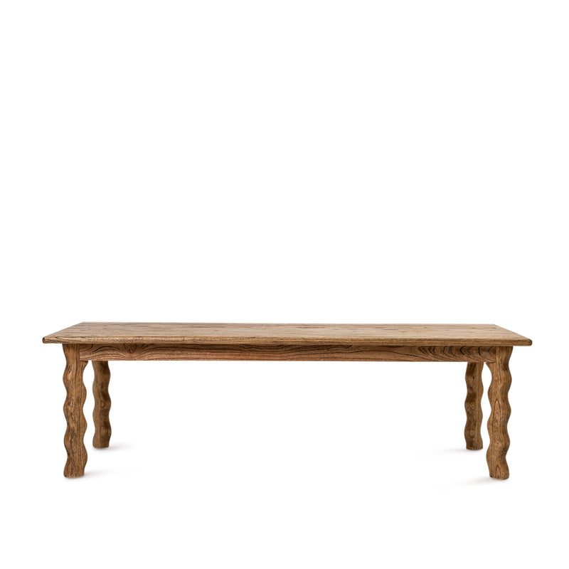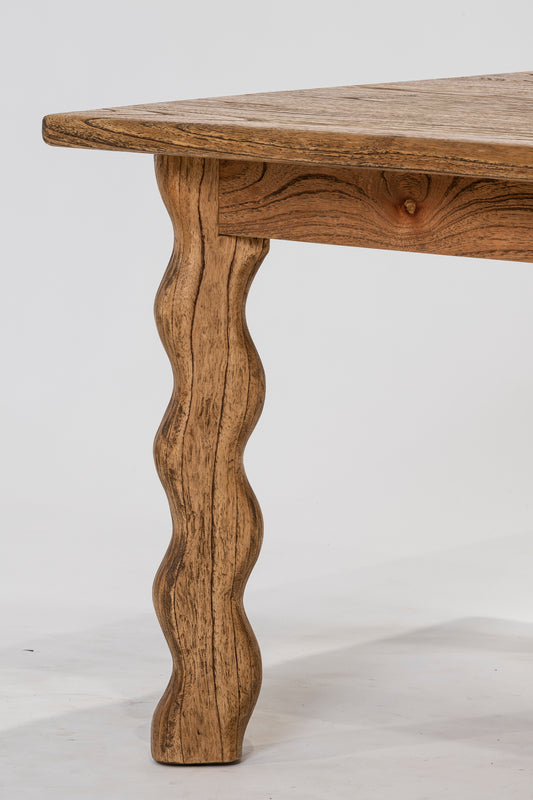 The Moses Dining Table is crafted from solid mindi wood in antique finish, featuring a unique and distinctive wobble leg design. This table is designed to bring a touch of practical chic to any dining space.
