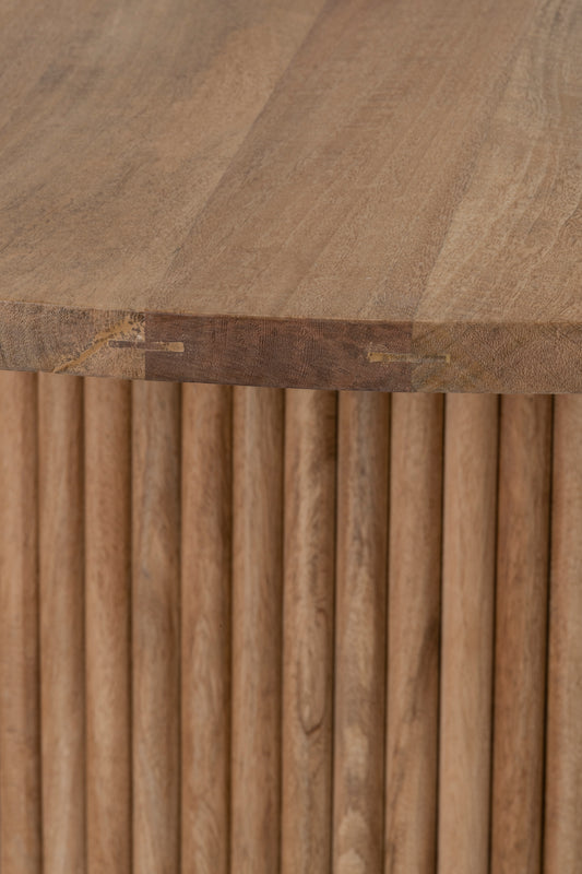 Built from solid mango wood in a rustic matte finish. Round top with a solid ribbed pillar base.