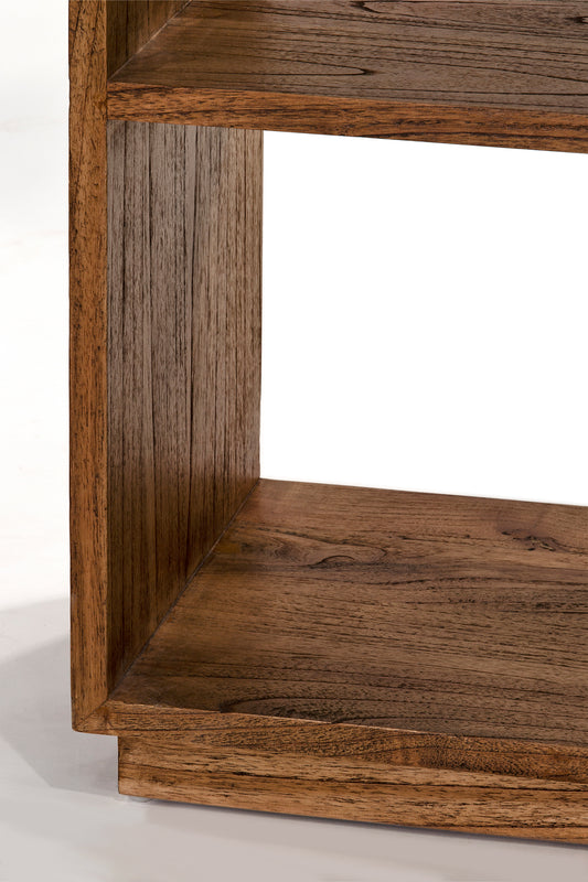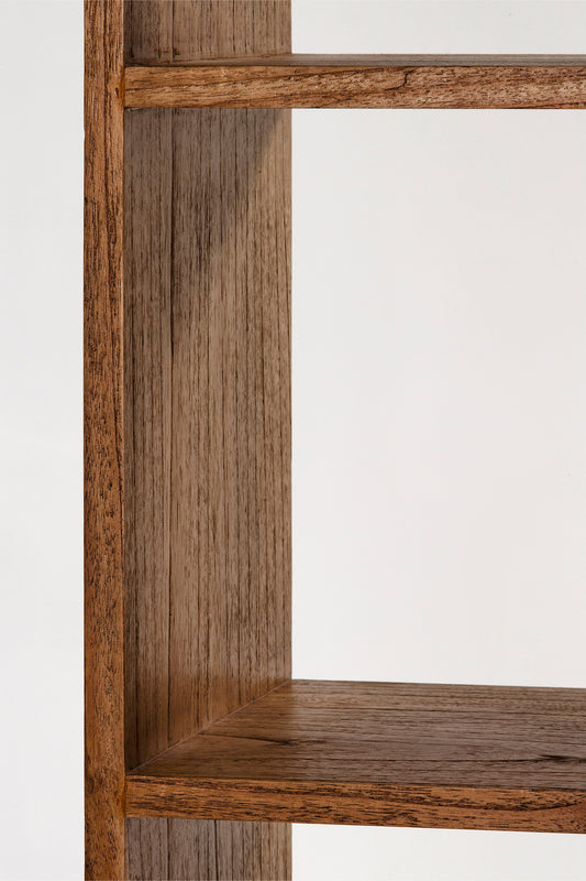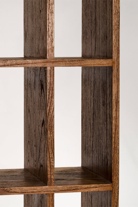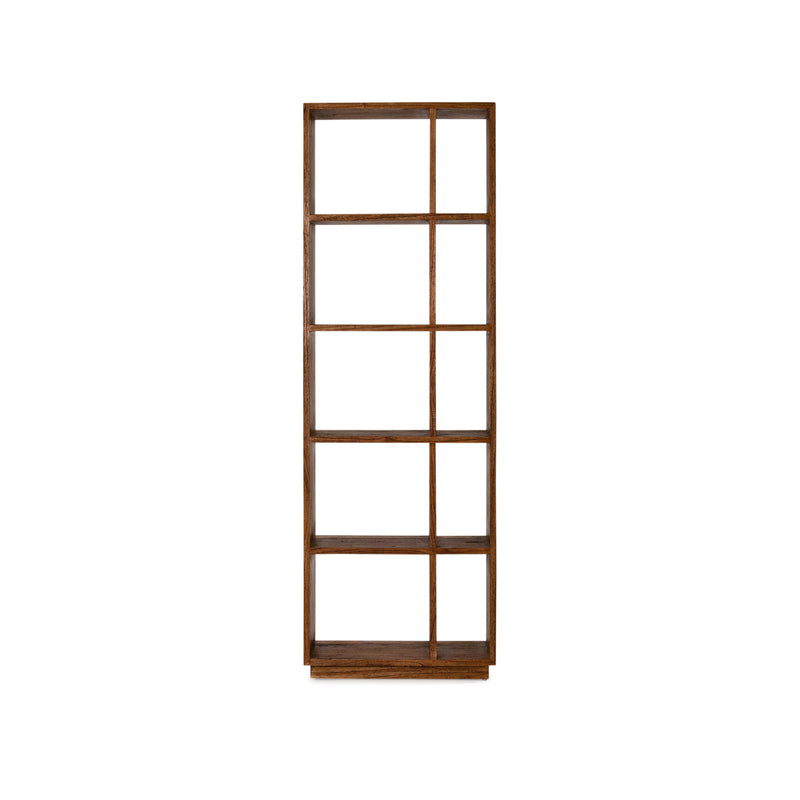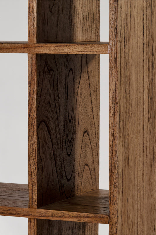 Built from solid mindi wood in antique finish. Tall rectangle shaped with ten open storage compartments.