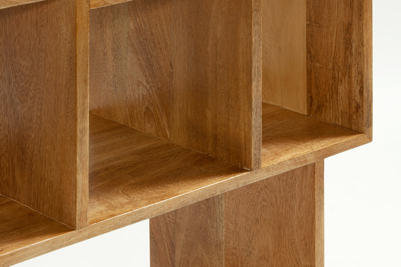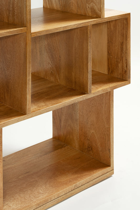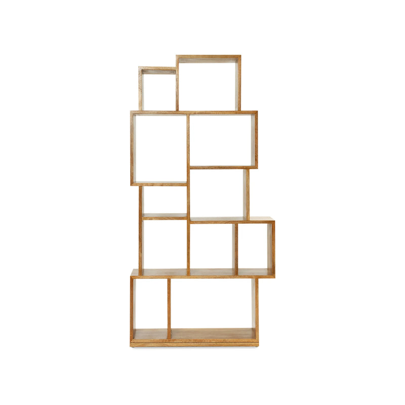 Built from solid mango wood in rustic matte finish, complete with eleven offset display spaces in varying sizes and shapes. Available in large and small size.