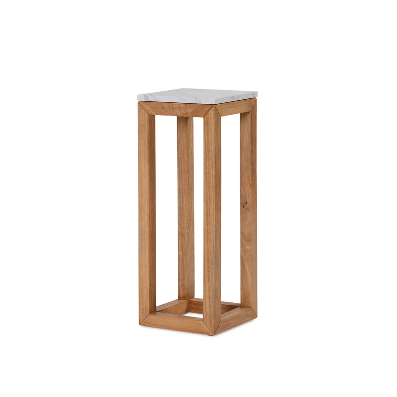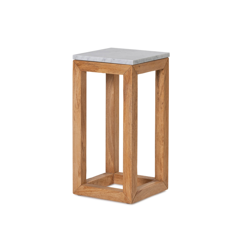 The Parlour Stand features a rectangular, open middle design, constructed from mango wood with rustic finish and white Carrera marble top. Its timeless design will provide a versatile and stylish addition to any home.
