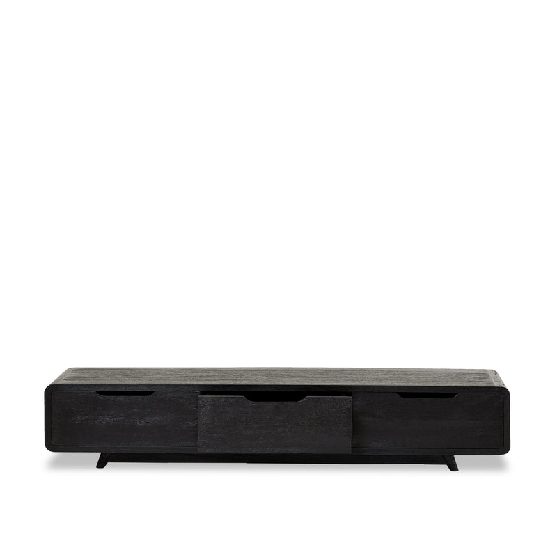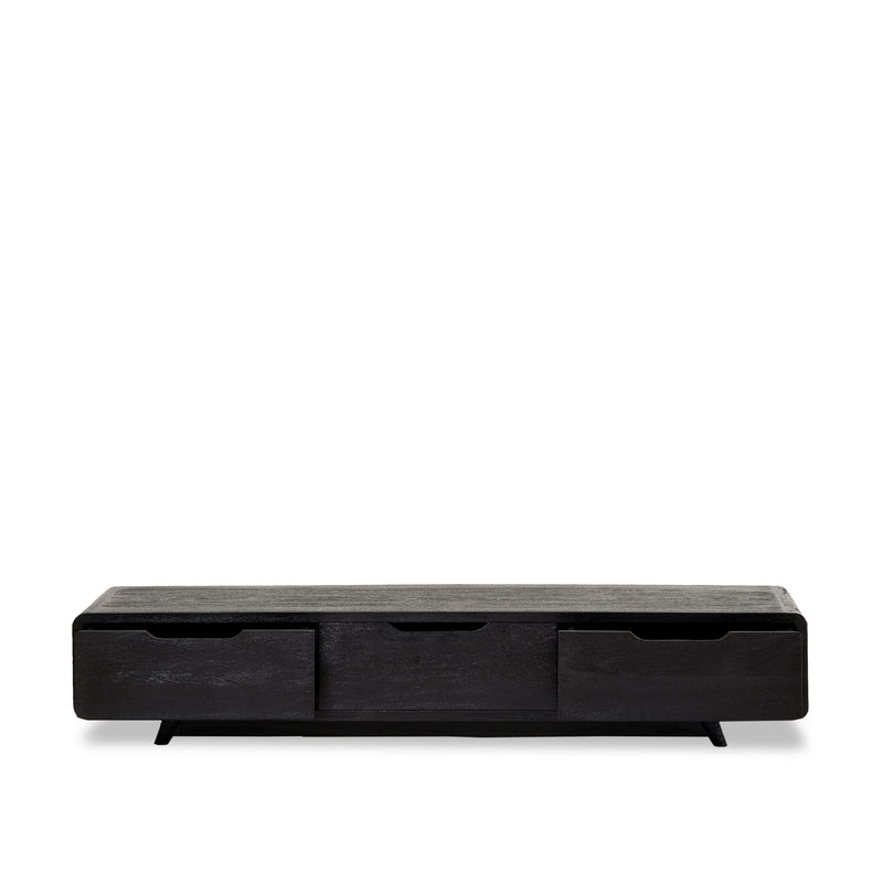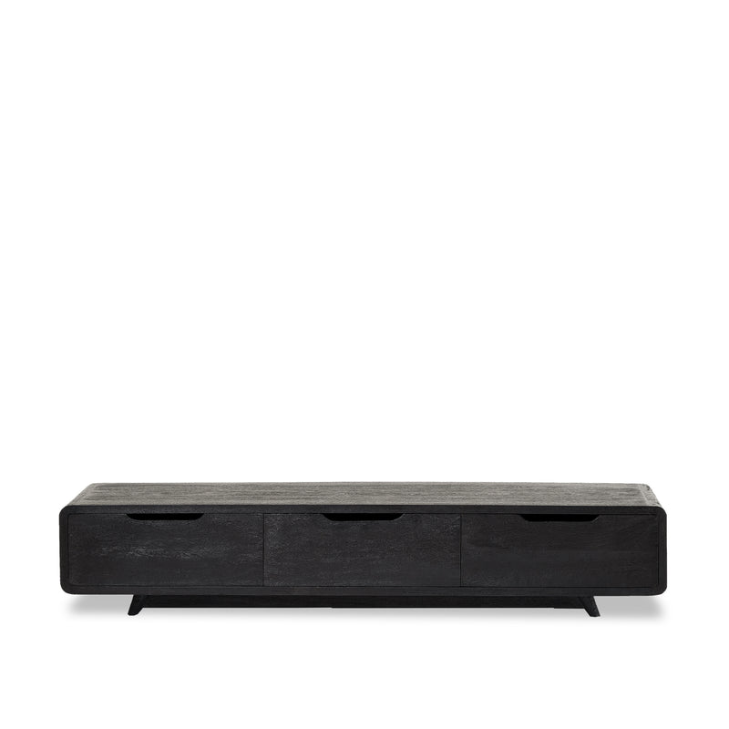 The Penfolds Chest or Entertainment Unit, made from solid mango wood in black finish featuring large sliding drawers with cut out handle. Pictured is the Penfolds 1x3 (one drawer high and three drawers wide). Please refer to the Penfolds configuration information sheet for further options.