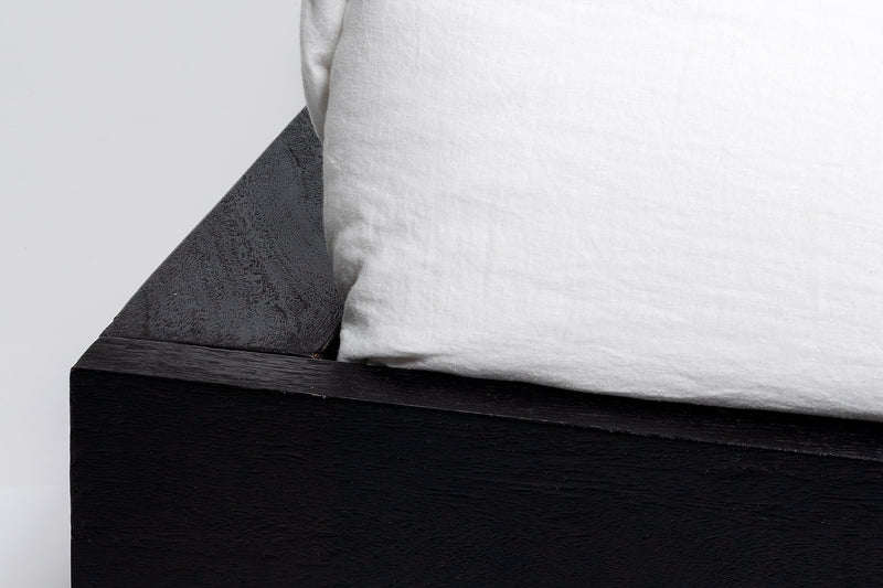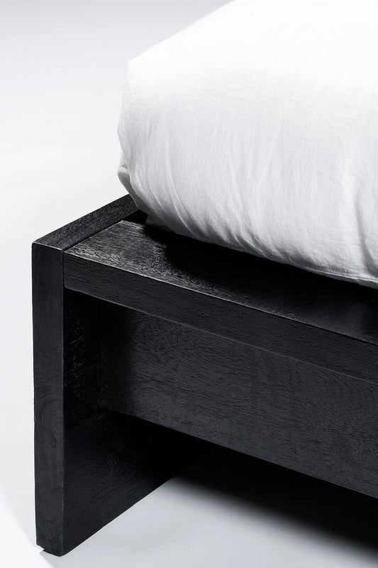 Sleek wooden bedhead and frame made from solid mango wood with clean square edges.