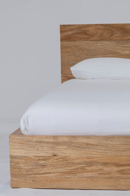 Sleek wooden bed frame with clean square edges made from solid mango wood in rustic matte finish.