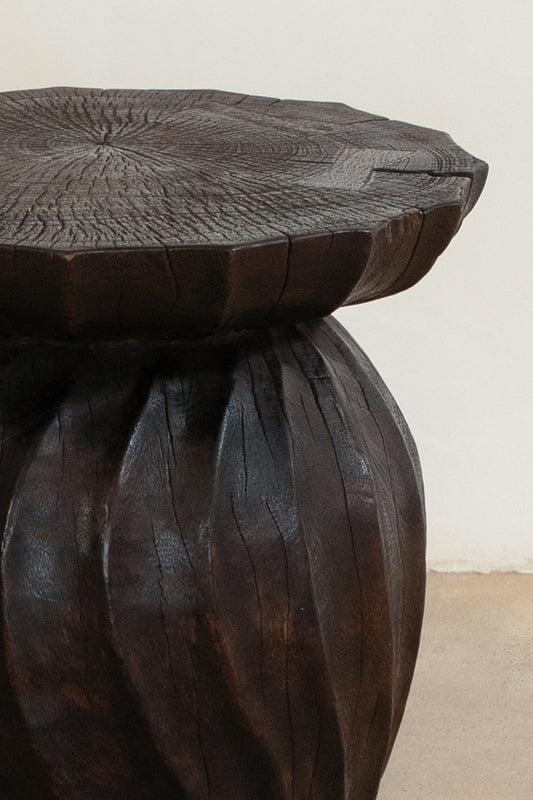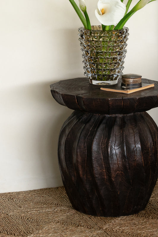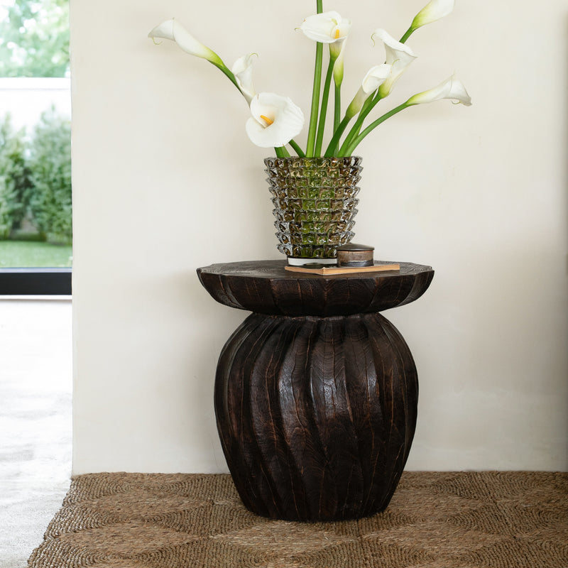Crafted from mango wood with a sculptural, curved silhouette and a smooth round top. The carved texture and dark-stained finish highlight the natural grain and form of the timber, making each piece unique. Colours and finishes between items may vary slightly due to the natural nature of the wood.