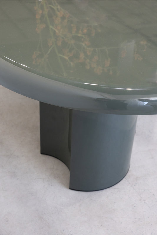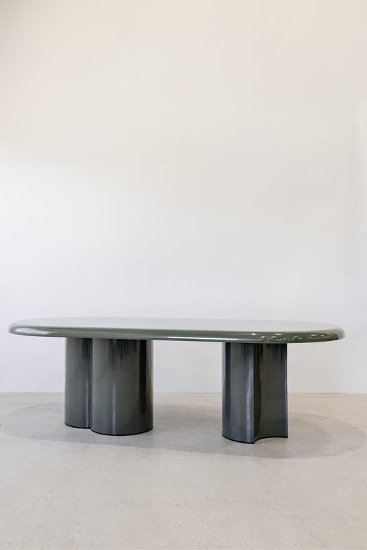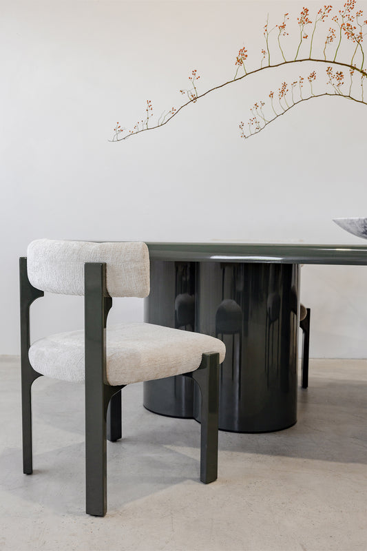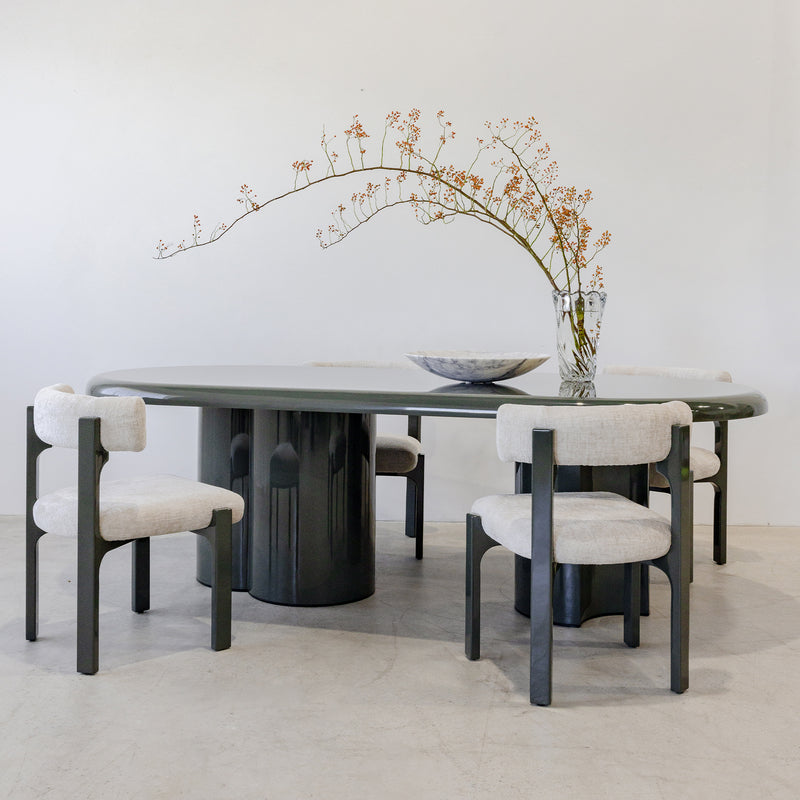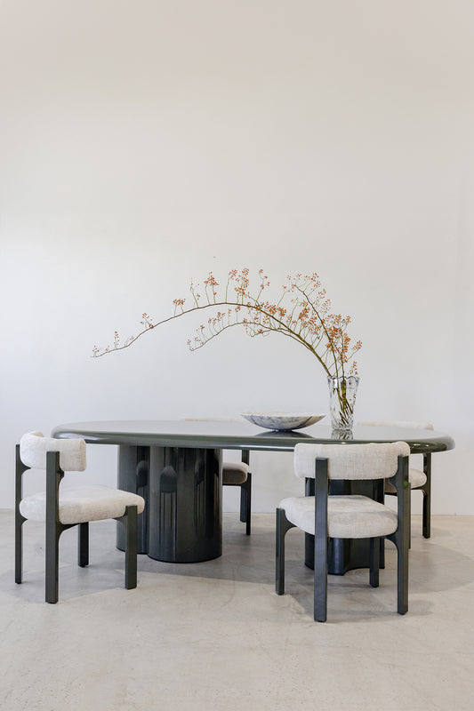 Simplistic elegance and sculptural silhouettes paired with deep olive tones and glossy finishes. A robust dining table to make a striking statement against both pale neutrals and warm timbers.