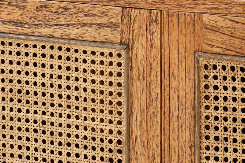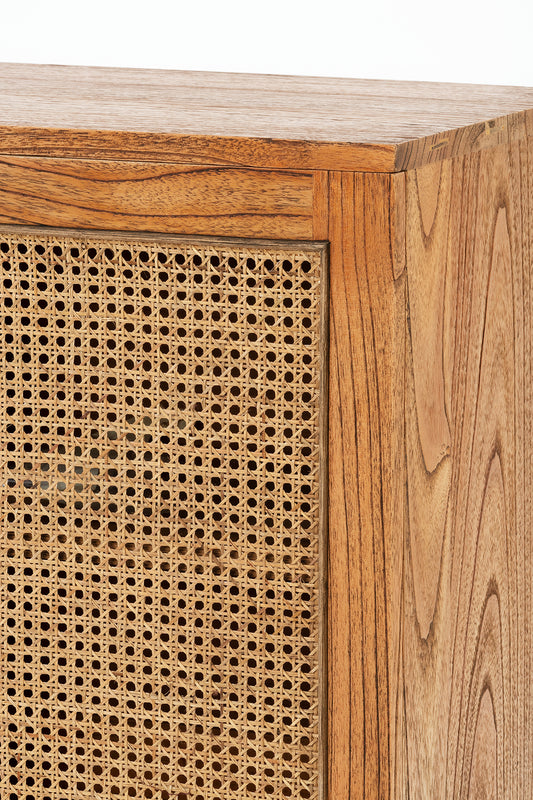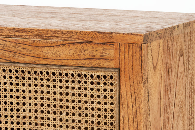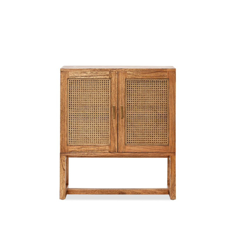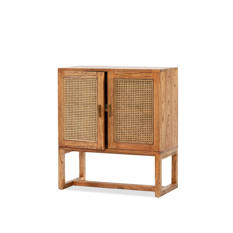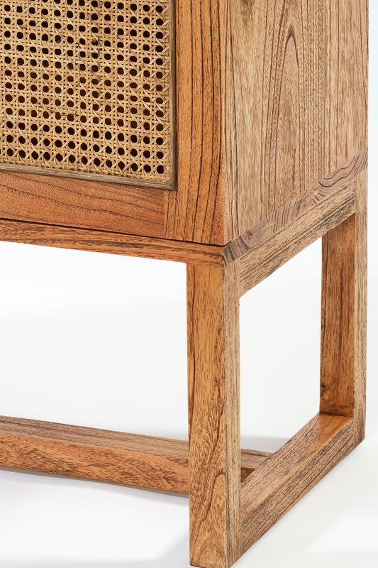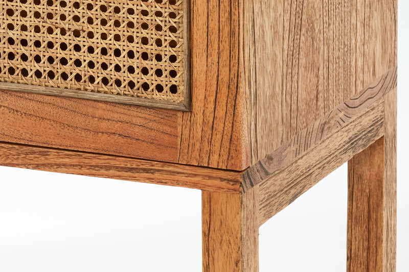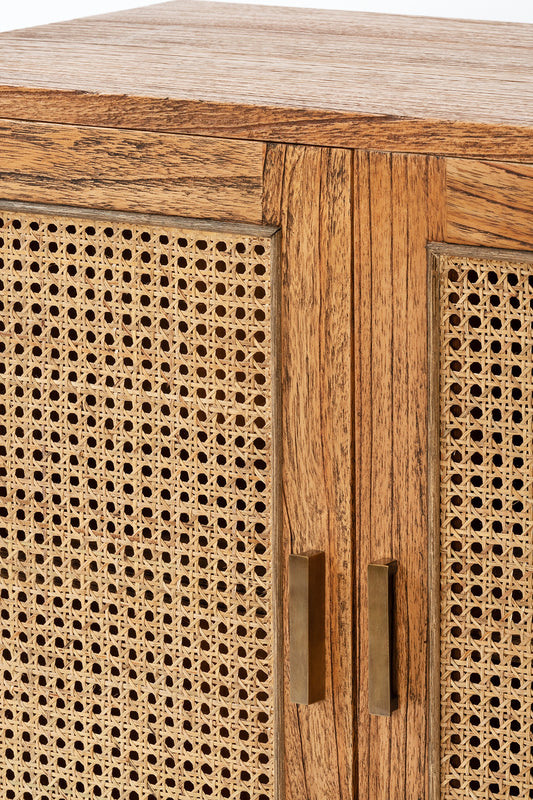 Built from mindi wood in Antique finish. Two doors with antique rattan inserts and solid brass handles.