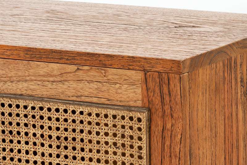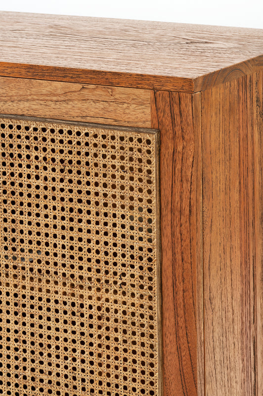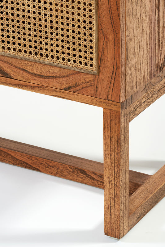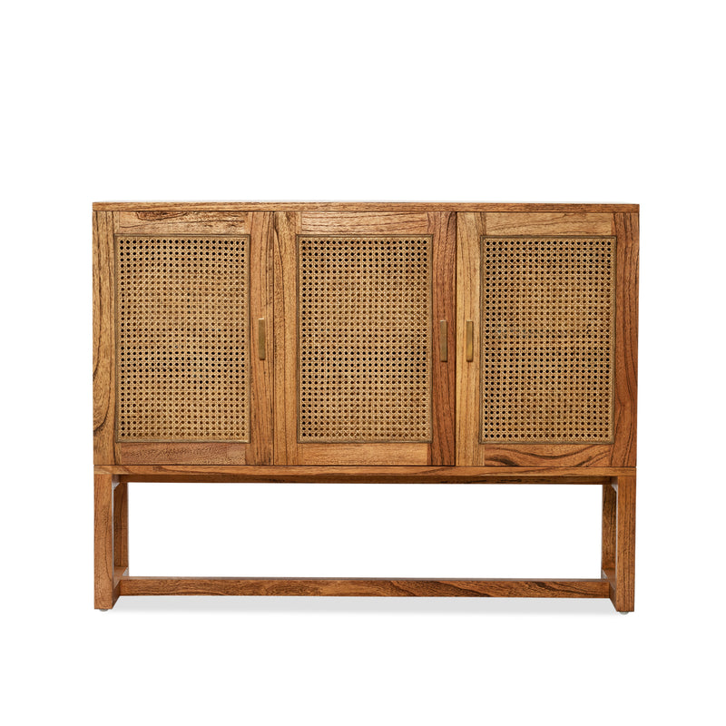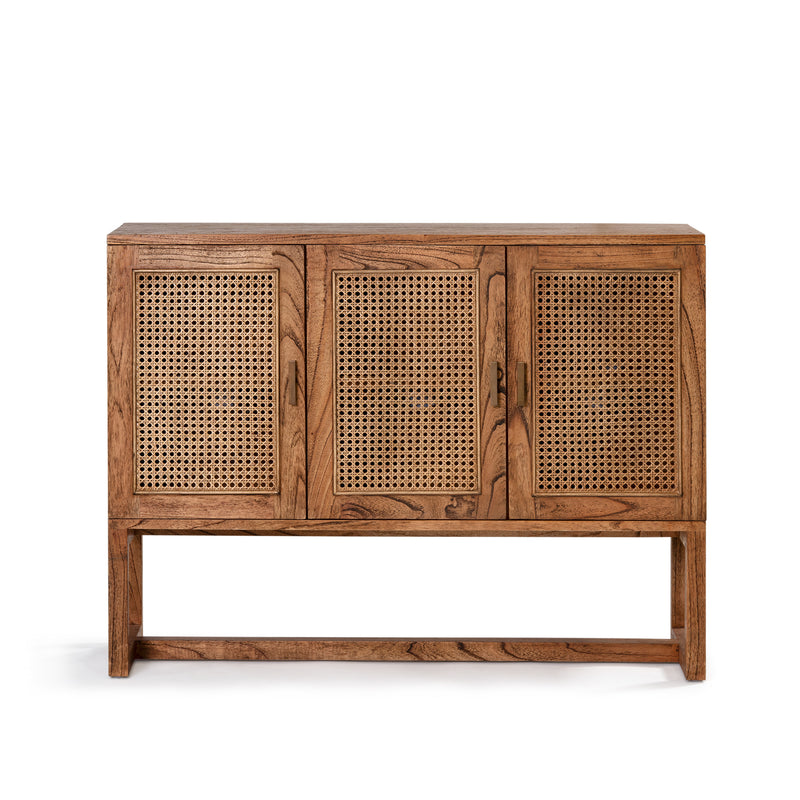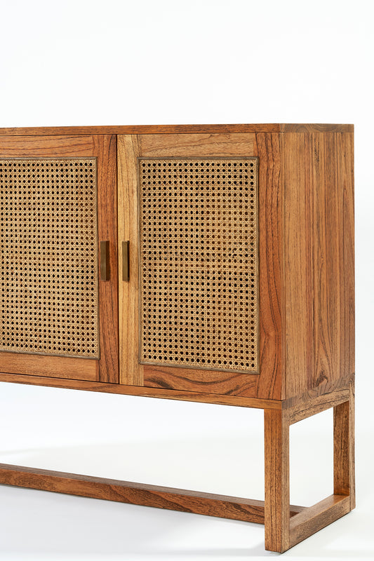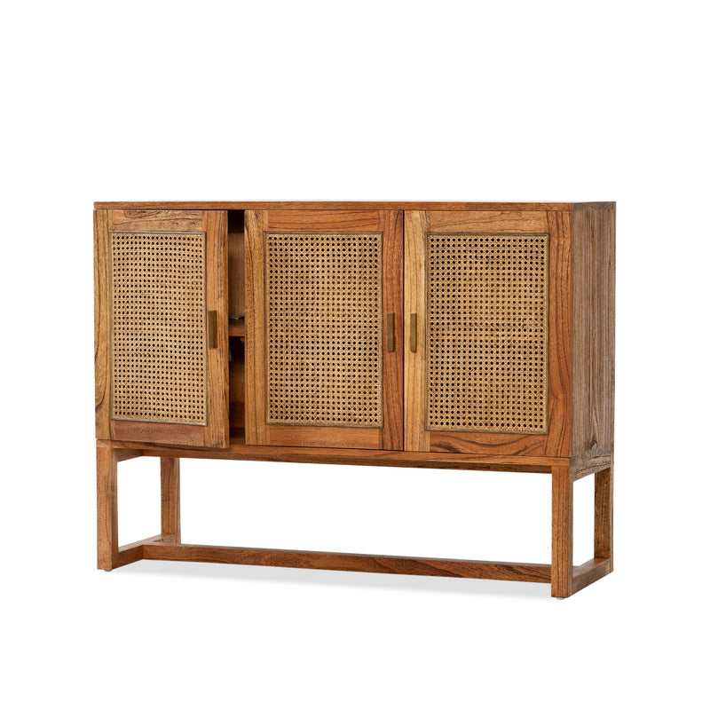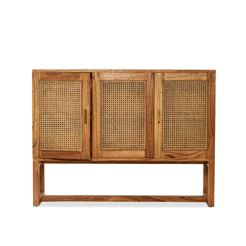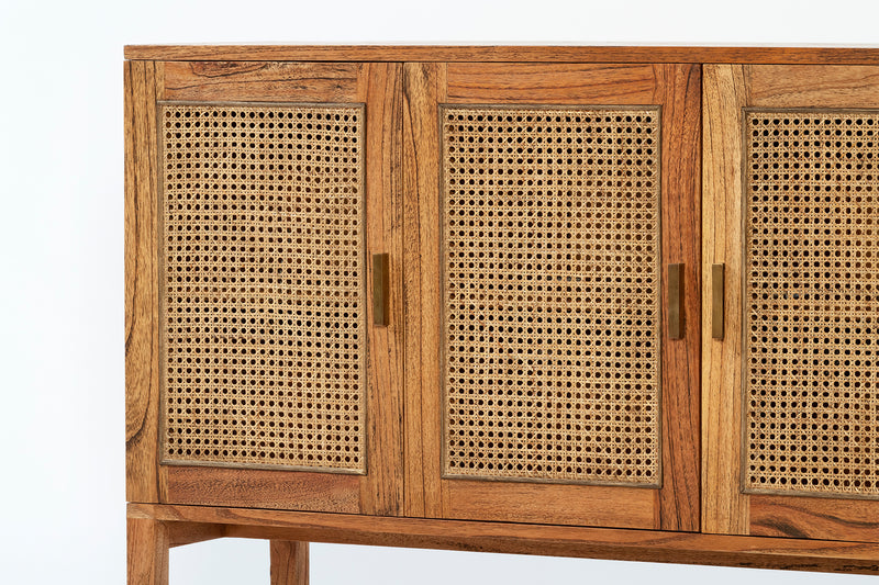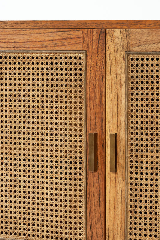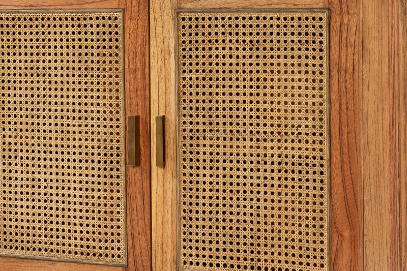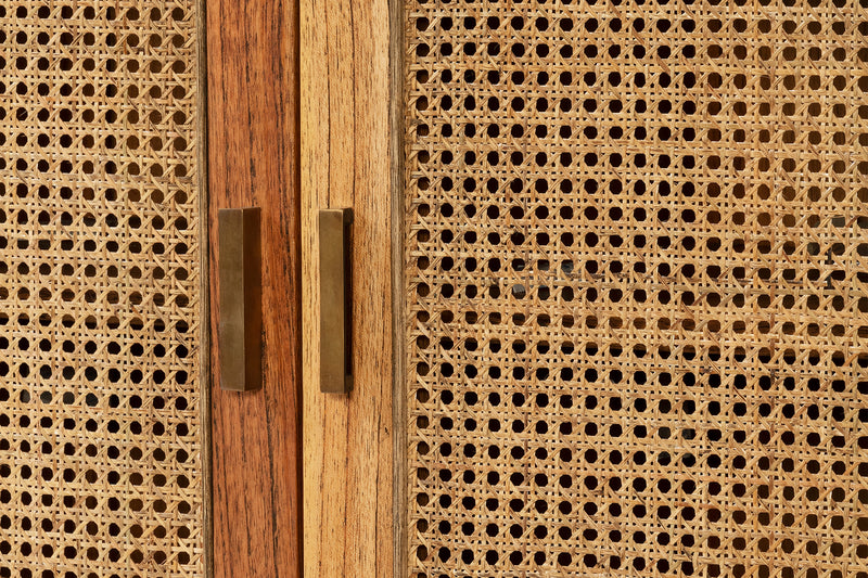 Built from mindi wood in Antique finish. Three doors with antique rattan inserts and solid brass handles.
