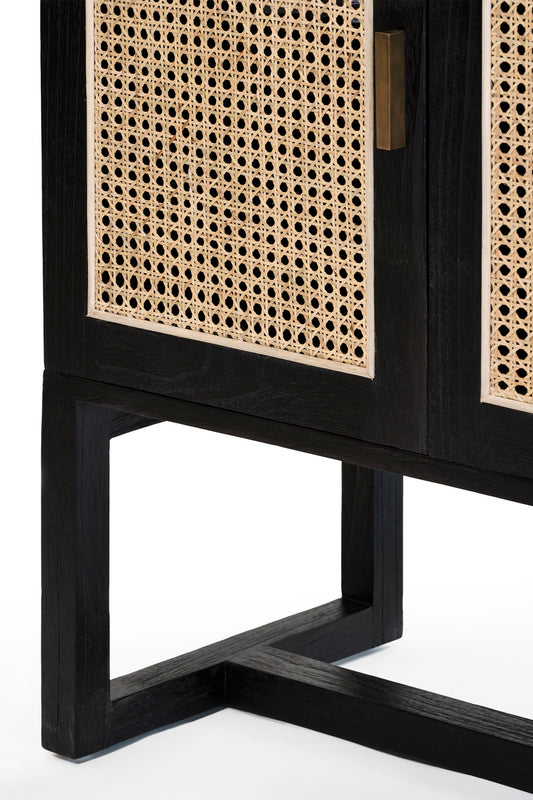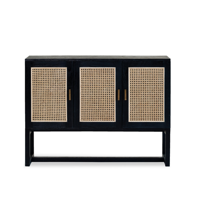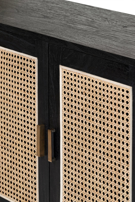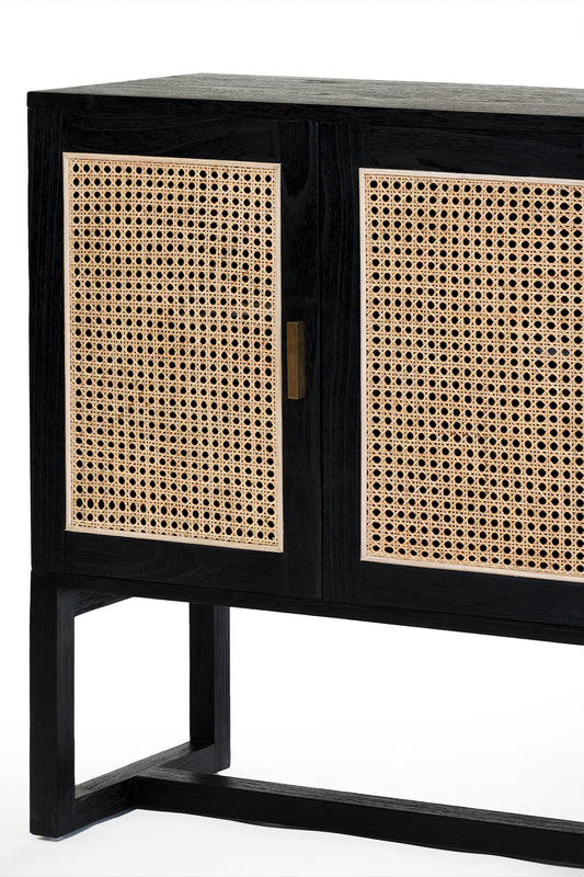Built from mango wood in Black finish. Three doors with antique rattan inserts and solid brass handles.