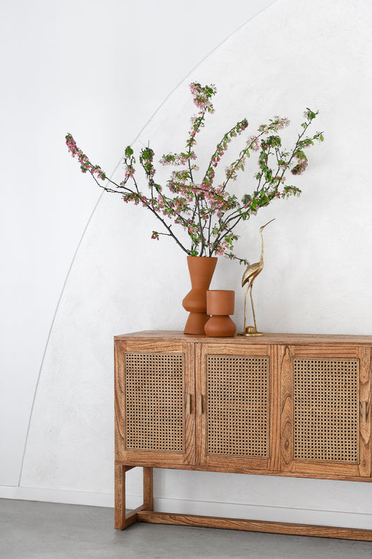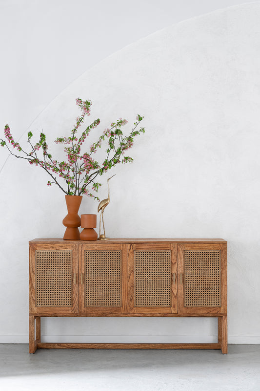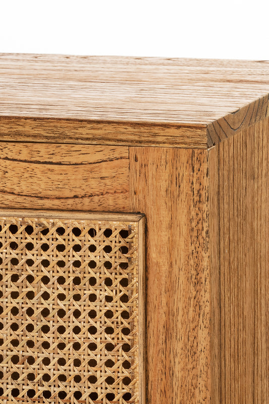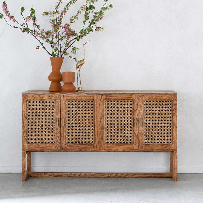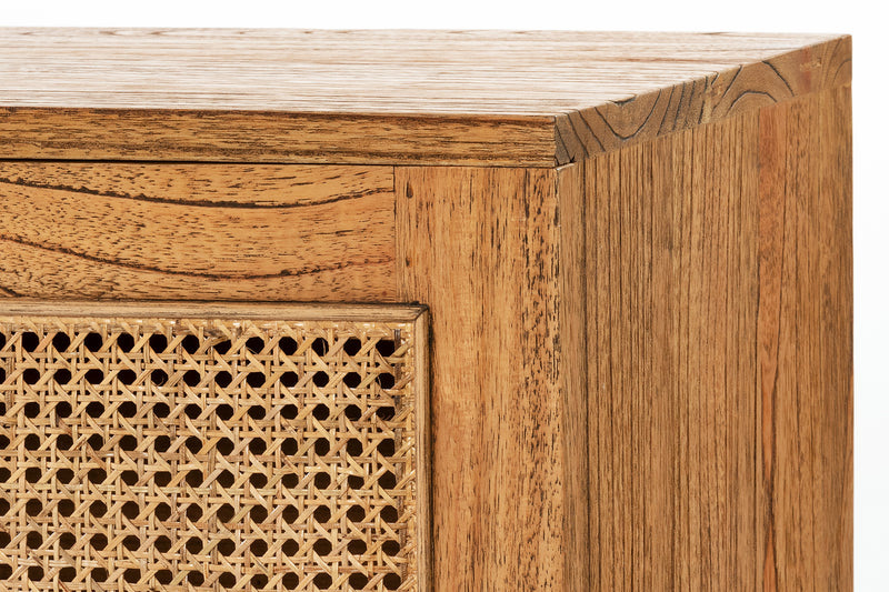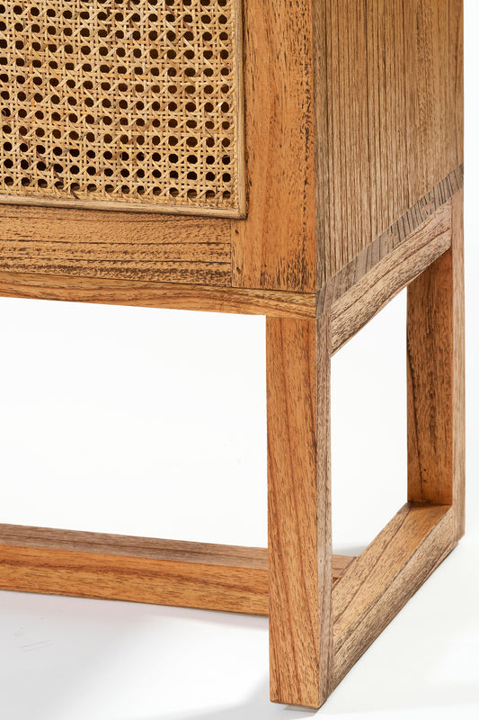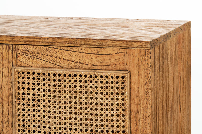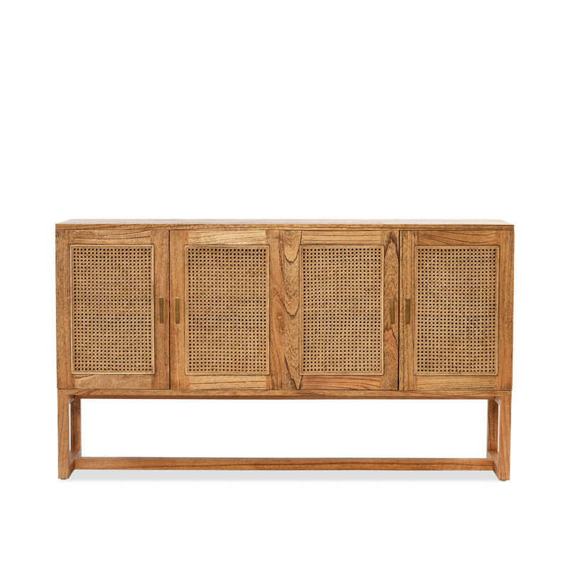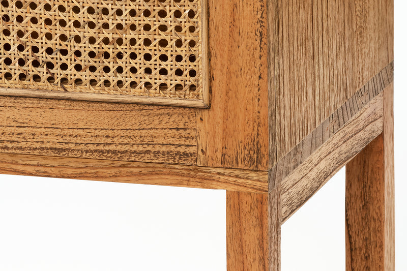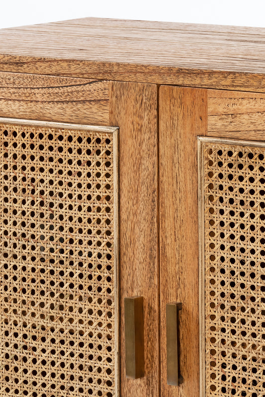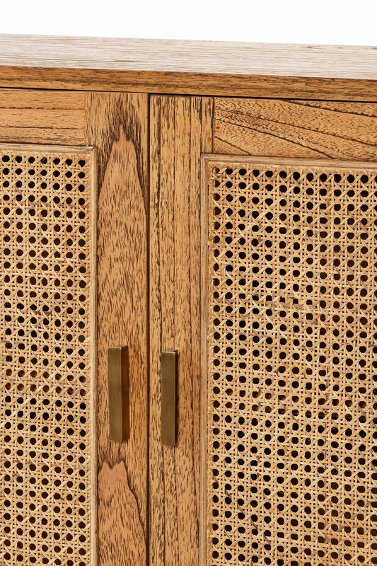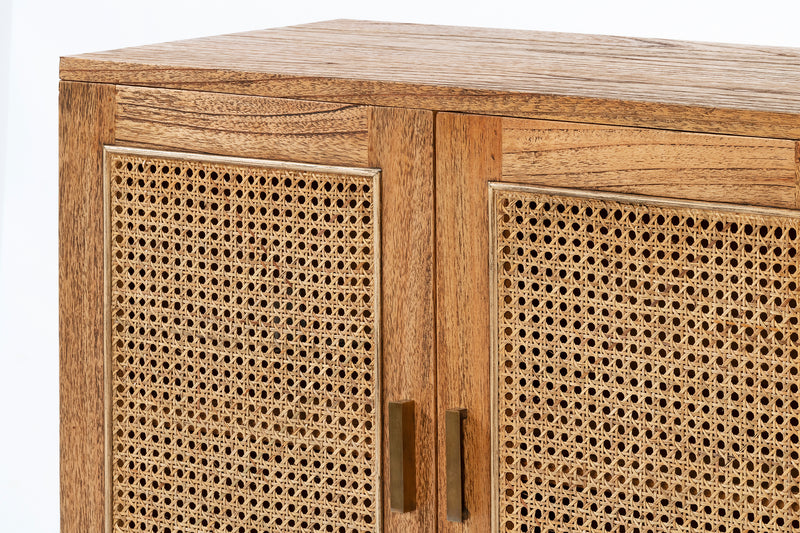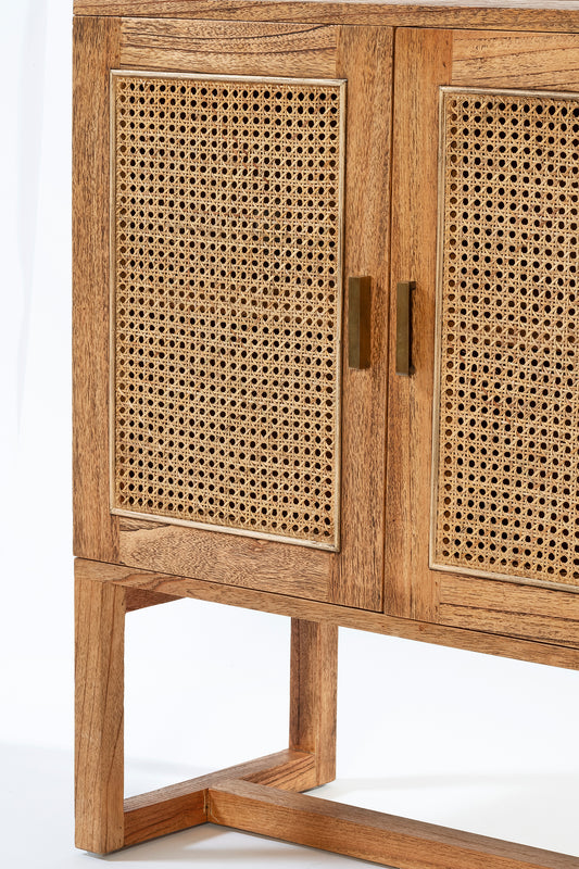 Built from mindi wood in Antique finish. Four doors with antique rattan inserts and solid brass handles.