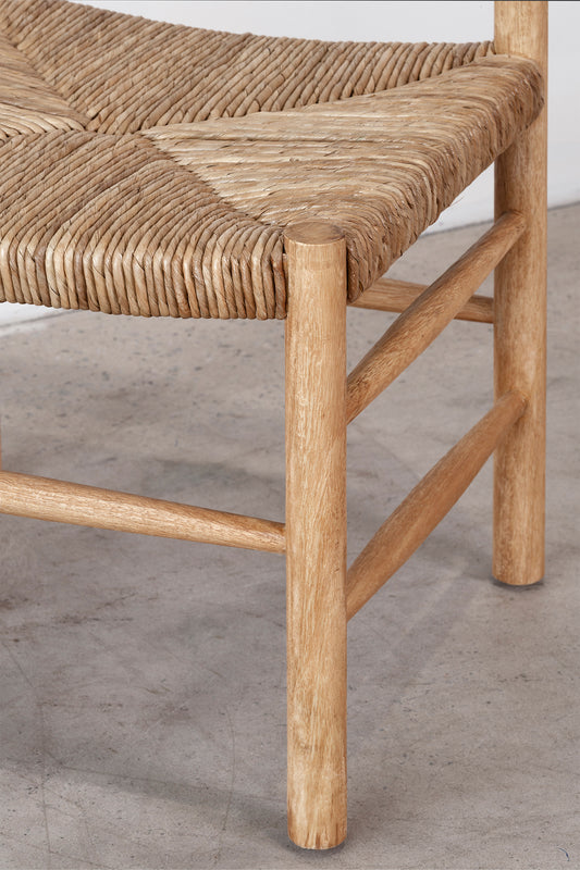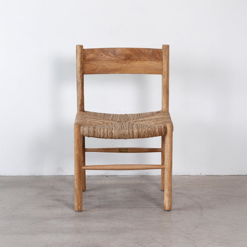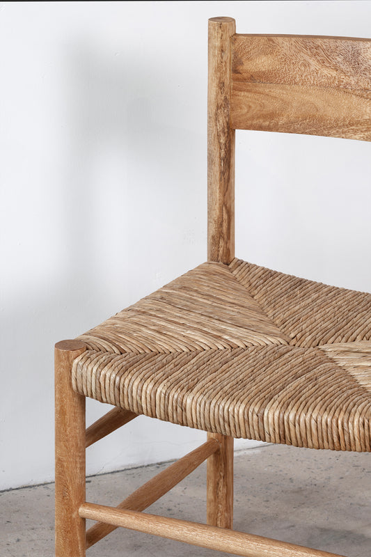 - Mango wood in a rustic matte finish frame with natural rush seat.