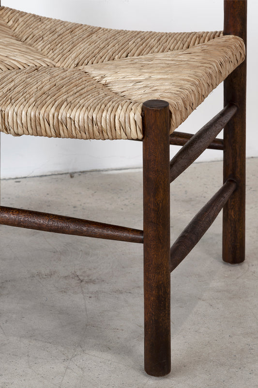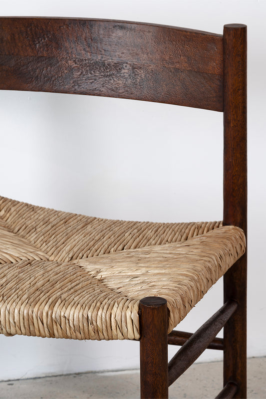 - Mango wood in a rustic walnut finish frame with natural rush seat.