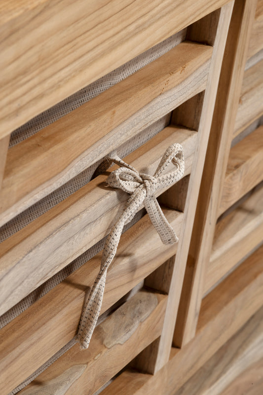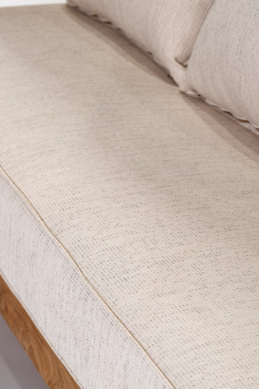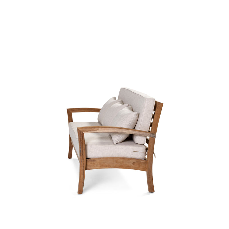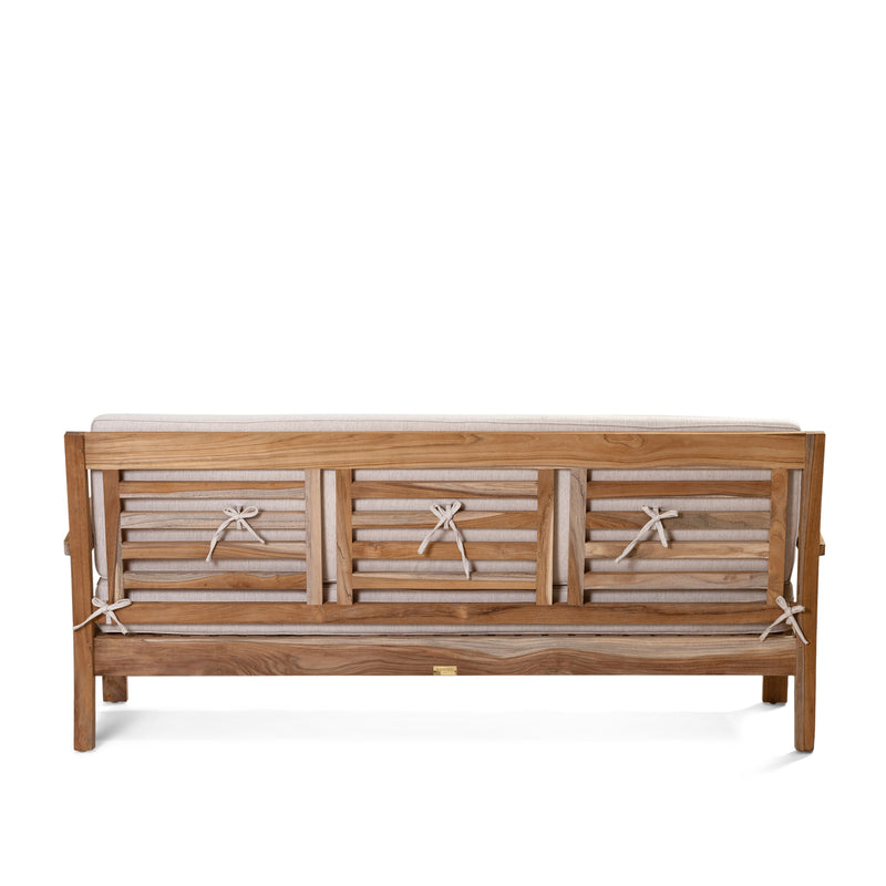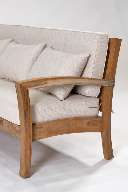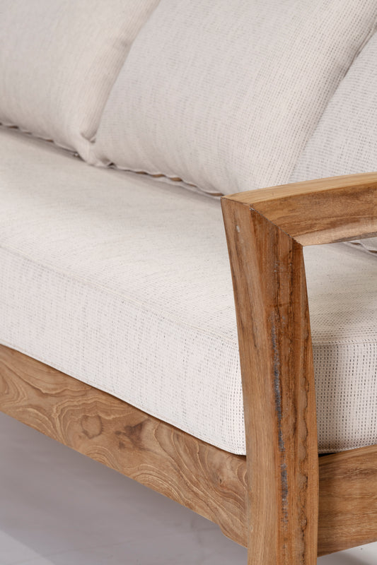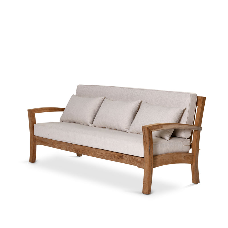 The Salur 3 Seater sofa constructed from durable teak wood in raw finish frame, complete with water-resistant cushions in Bahama Sand fabric.