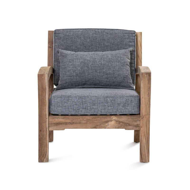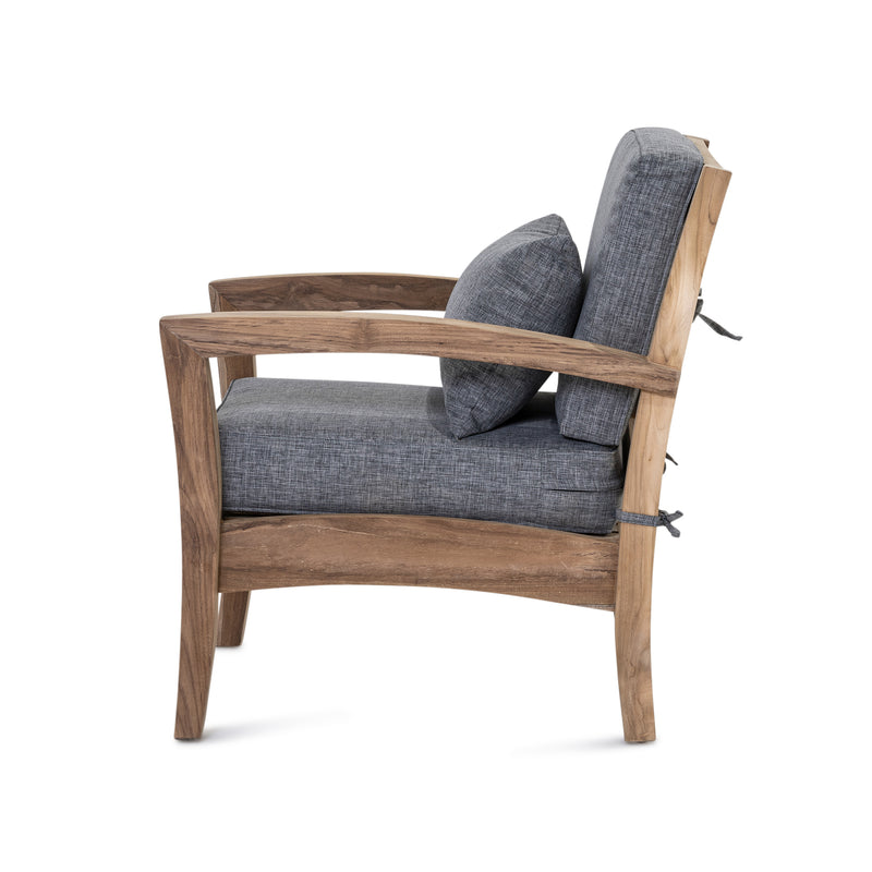 Raw teak wood frame with Aruba Grey upholstered seat cushion.