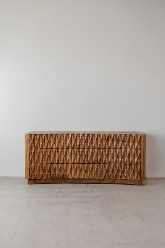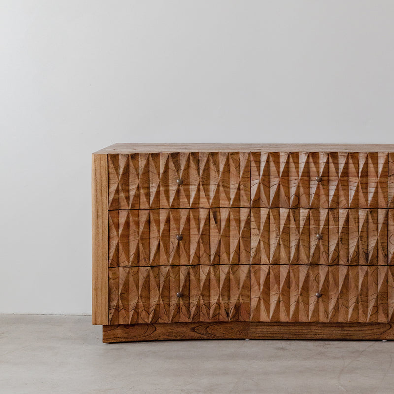 Built from solid mindi wood in Antique Mindi finish. Featuring slight curved shape front, 6 drawers with carving detail and solid round brass handles.