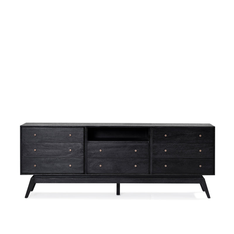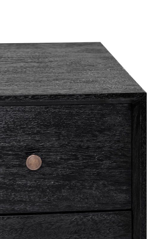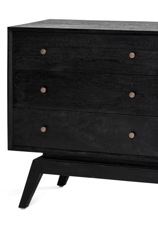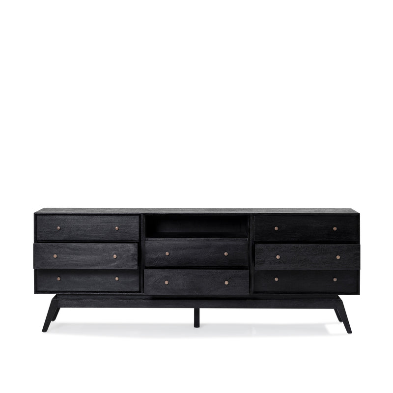 The Sari Chest 3x3 is built from solid mango wood with black finish. Featuring 8 drawers plus an open shelf with solid brass handles. The open shelf is optional.