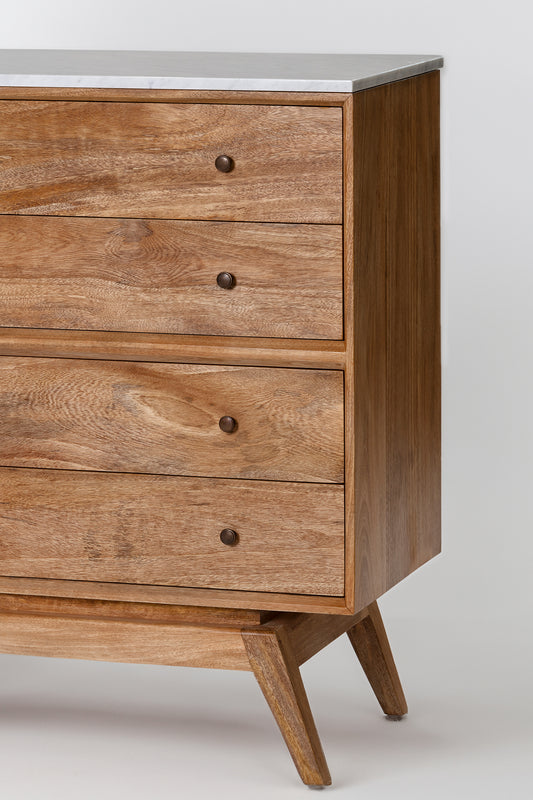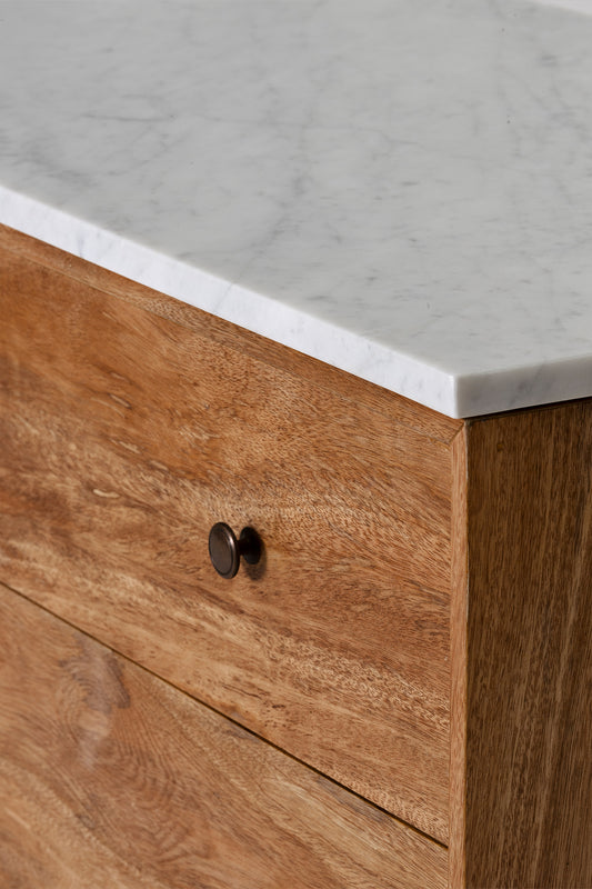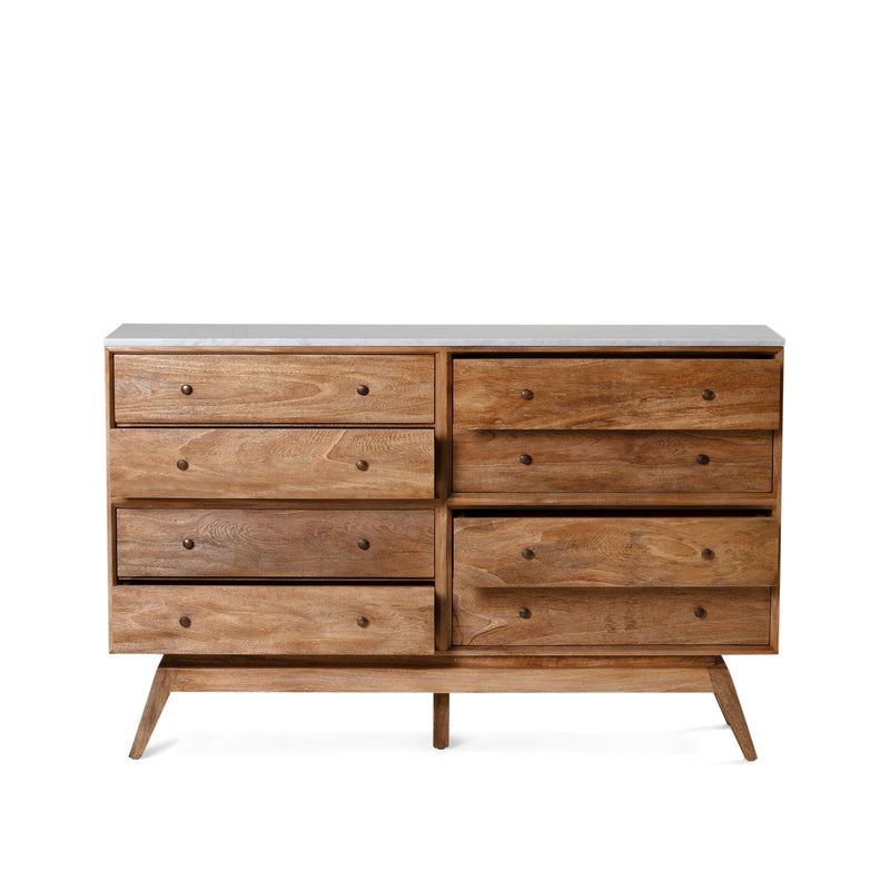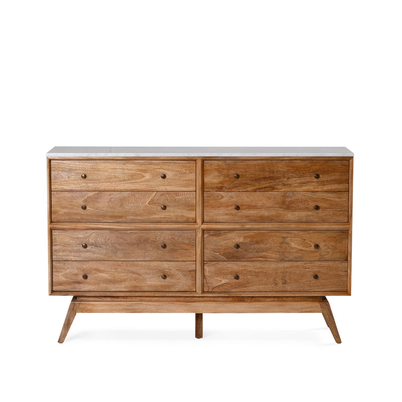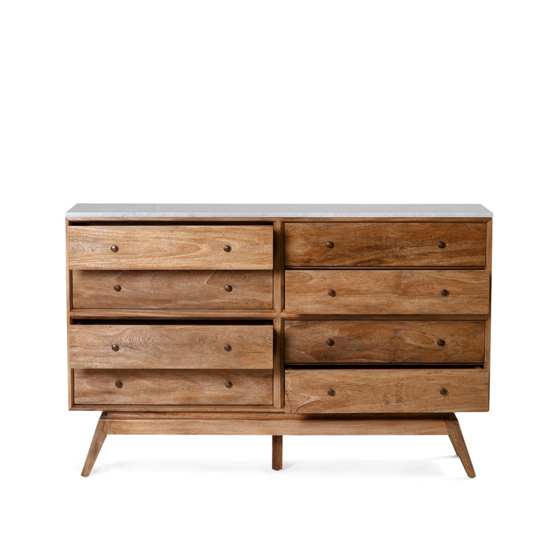 Built from solid mango wood with Natural Sealed finish. Featuring eight drawers with solid brass handles, and white Italian Carrara marble top.