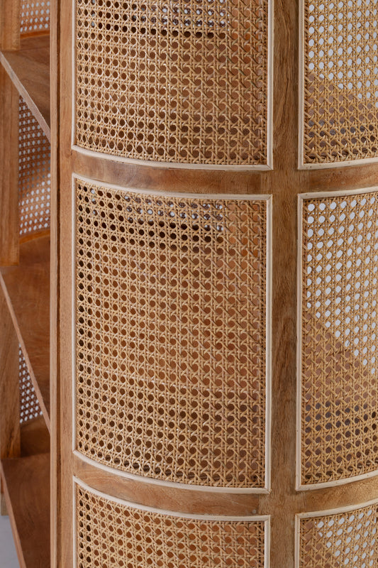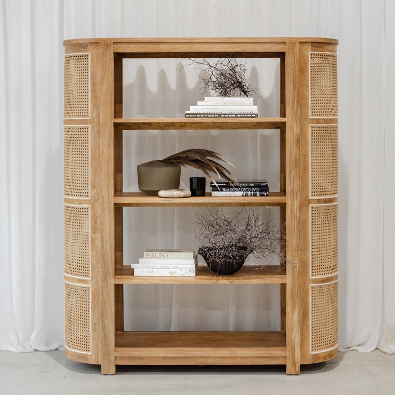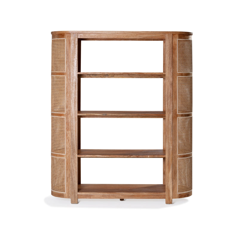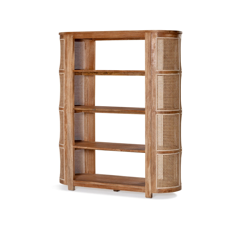 The Sergio Bookcase is crafted from mindi wood in an antique finish, featuring a rounded shape frame with antique rattan inserts and four open tiered shelving spaces.