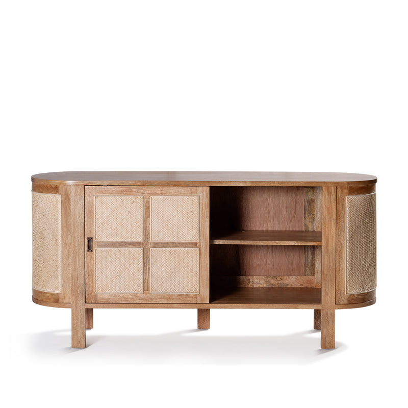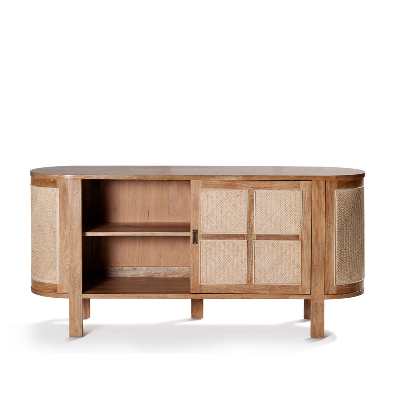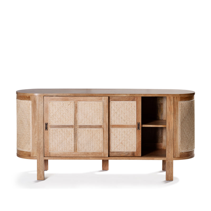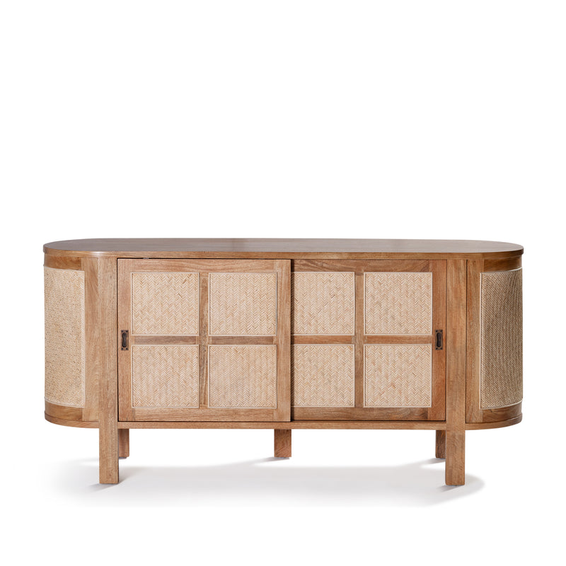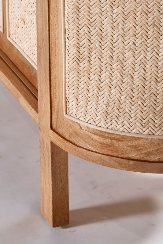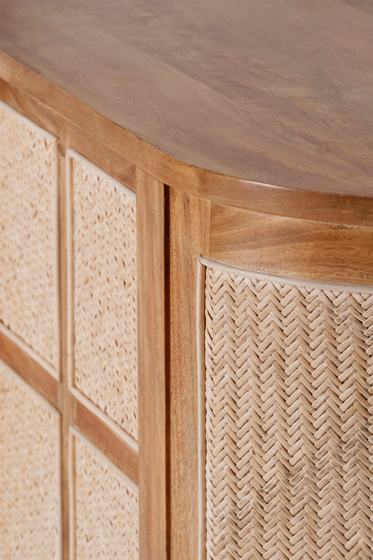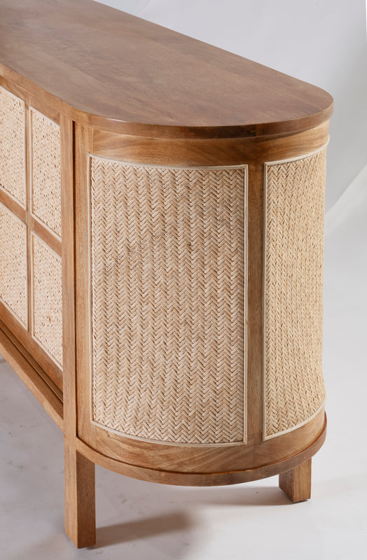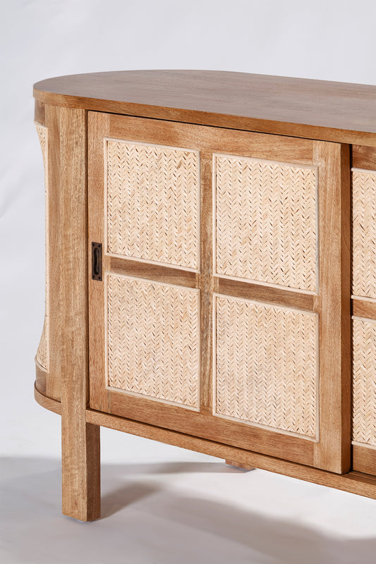 The Sergio Buffet built from mango wood in a natural sealed finish, featuring a rounded shape frame with two sliding front doors with natural rattan weave inserts and solid brass handles.