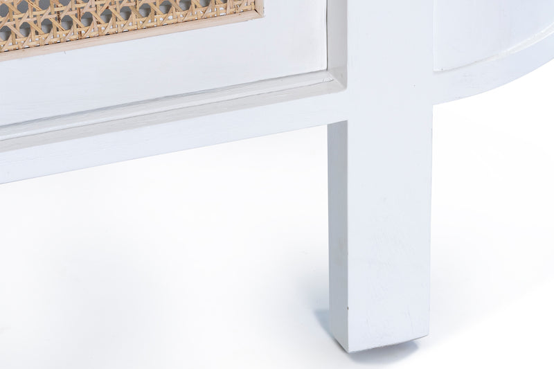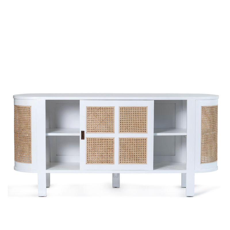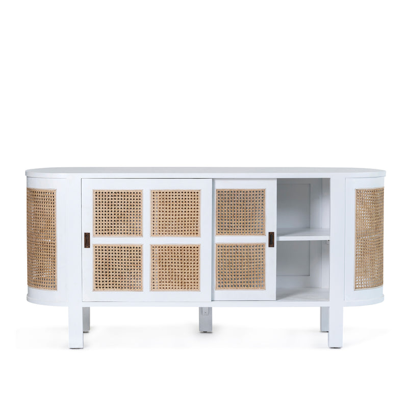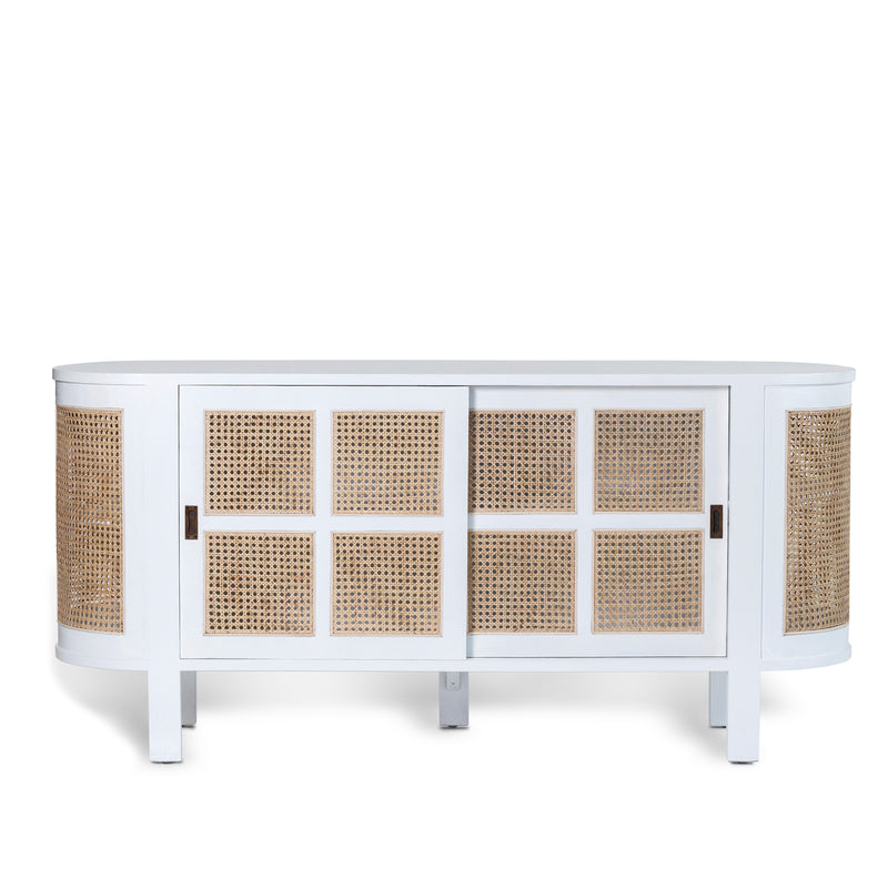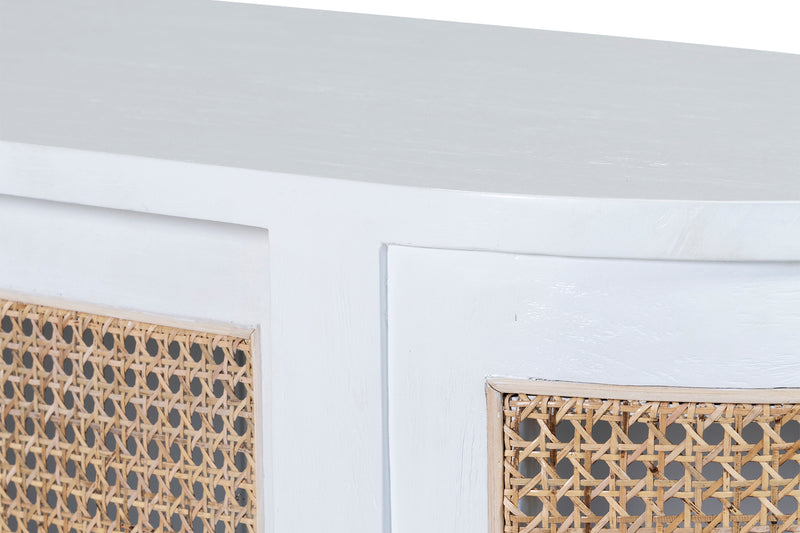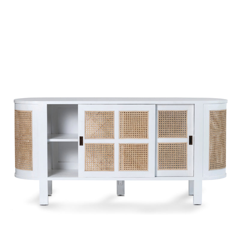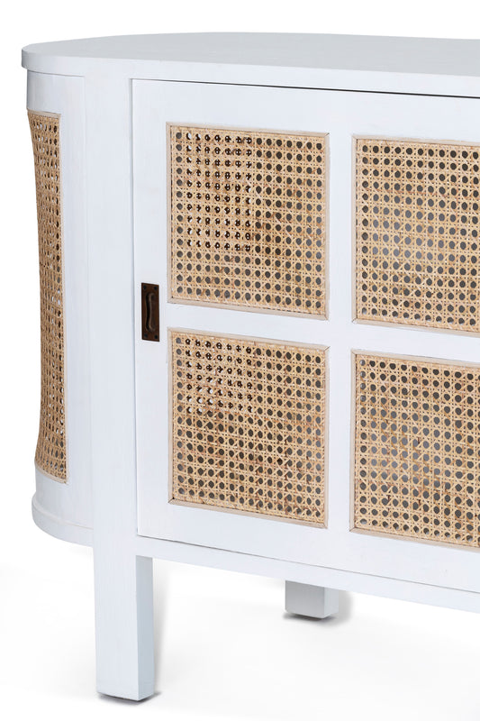 The Sergio Buffet built from mango wood in a white finish, featuring a rounded shape frame with two sliding front doors with natural rattan inserts and solid brass handles.
