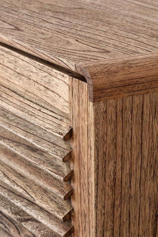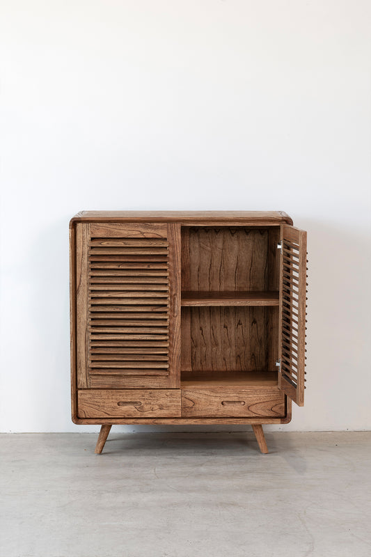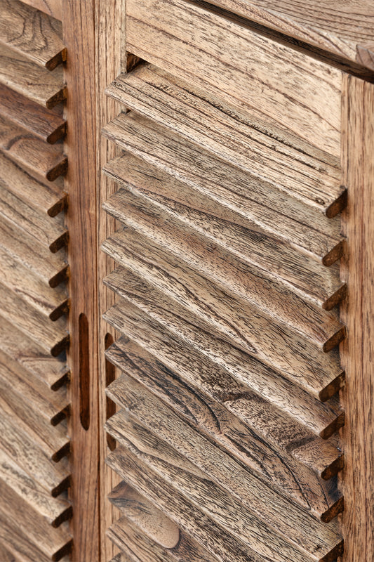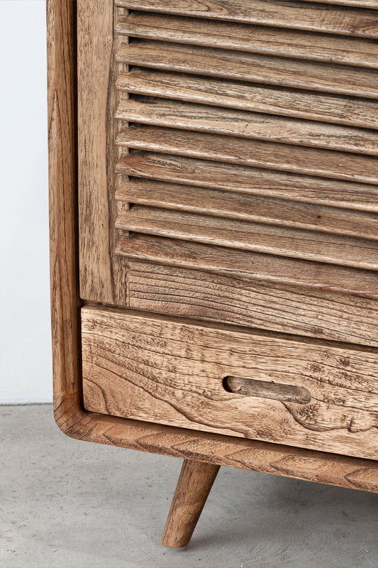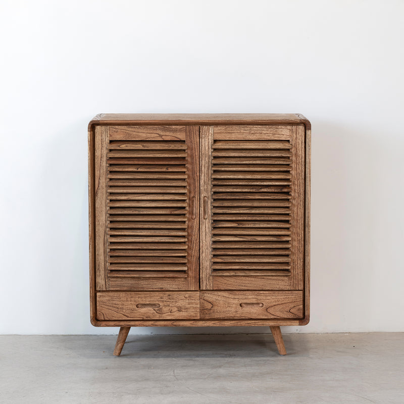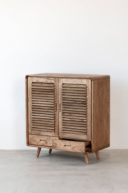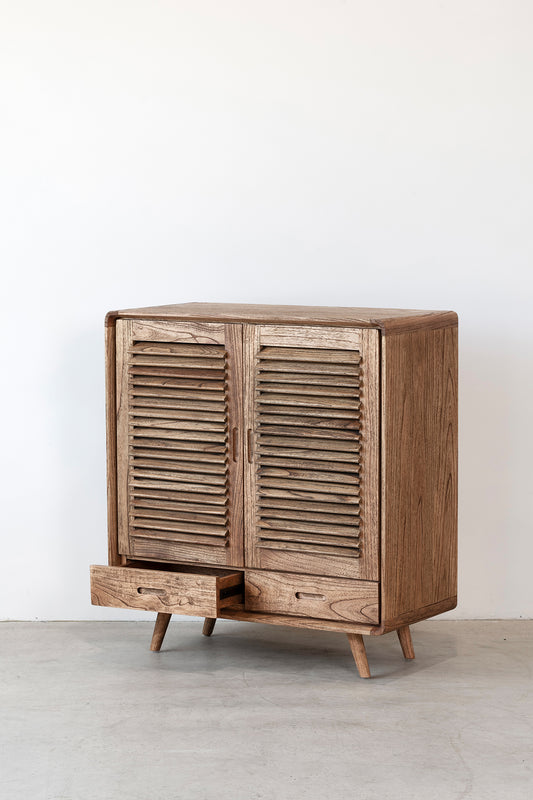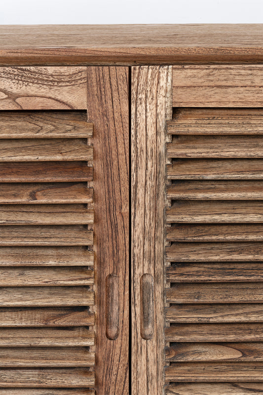 The Shutter Buffet, built from mindi wood in an antique finish, featuring two doors with louver shutters, two drawers and recessed handles.