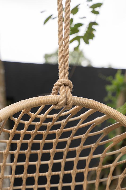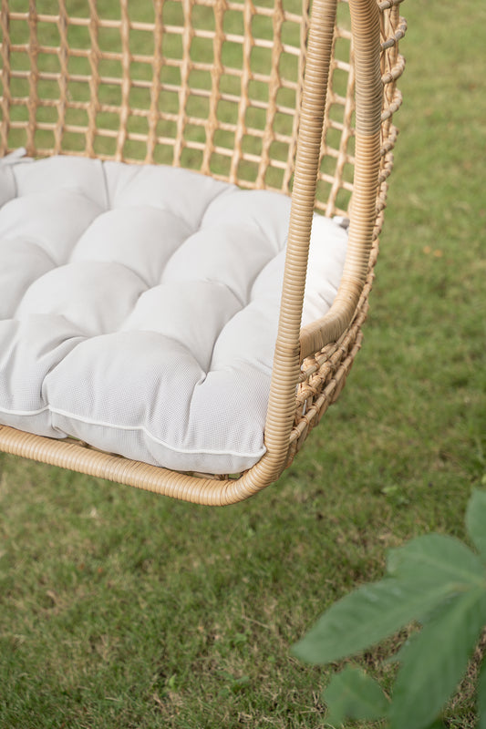 Relax and unwind in the luxurious Skye Outdoor Hanging Chair. Constructed from outdoor synthetic weave, with a lightweight aluminium frame. Complete with a sturdy rope for easy hanging and a water-resistant removable cushion in sunproof Palazzo 143 fabric with white piping. Style with a beautiful throw or cushion to complete the look.