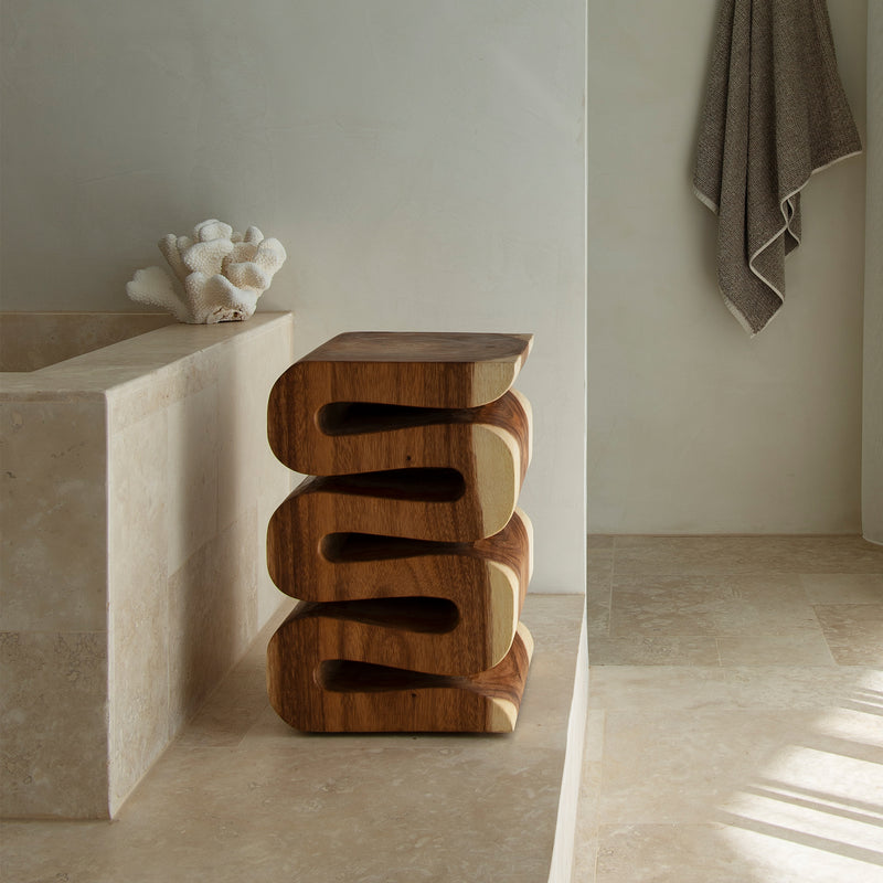 Constructed from raw meh wood with a sculptural snake pattern with flat surface. This hardwood stool is highly durable. Colours/finishes between items may vary and some slightly cracking can occur, due to the natural nature of the timber.