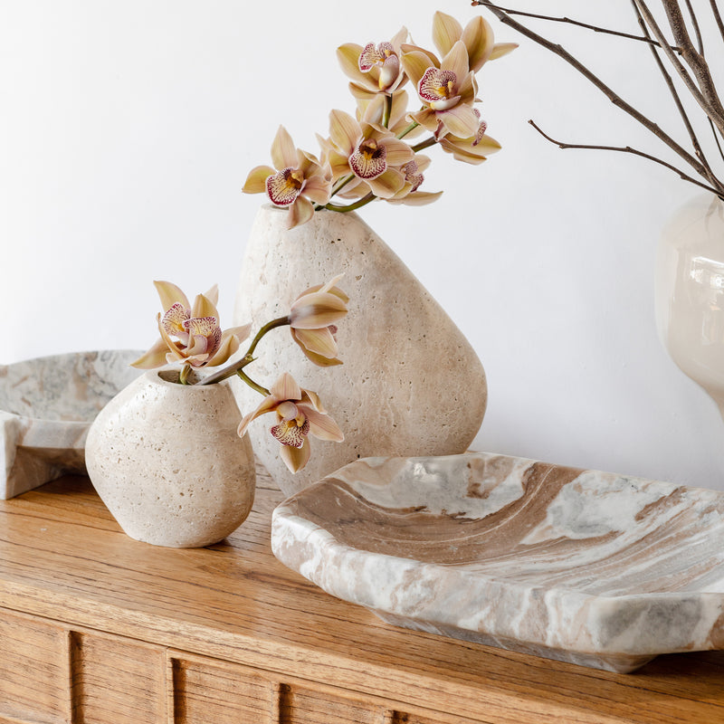 A perfect addition to your home decor, the Suki octagon marble bowl is made of solid white marble with brown veining, a unique piece for your tabletop, hallway table or coffee table.