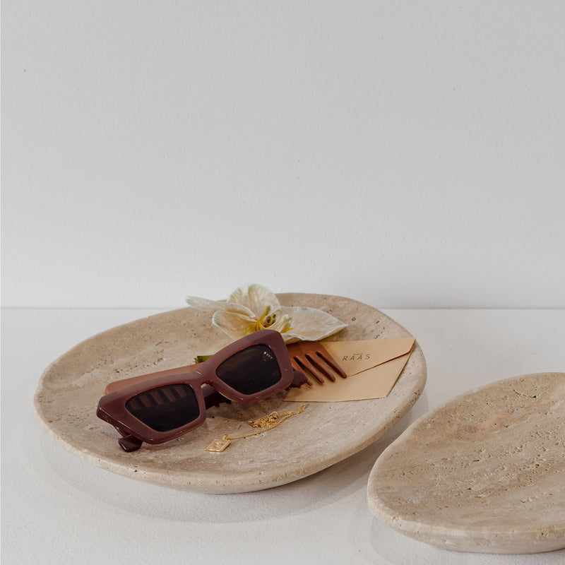 Expertly crafted with a natural formed shape, the Talon Marble Asymmetrical Tray is crafted in a stunning travertine. Elevate your home decor with this functional yet stylish piece, perfect for serving or displaying any items.