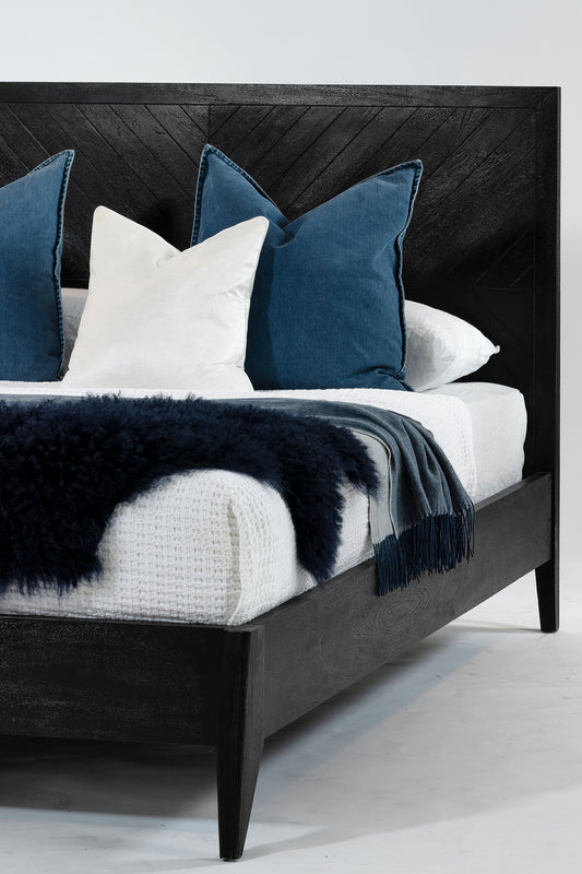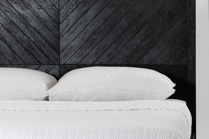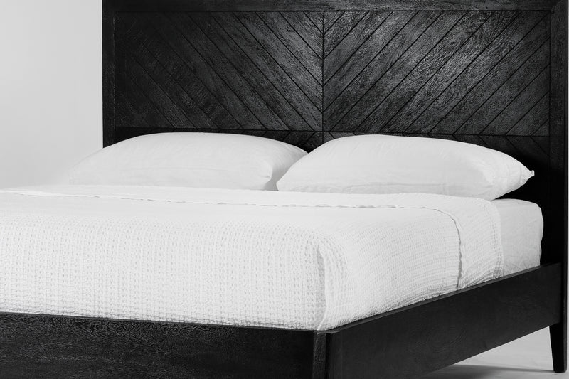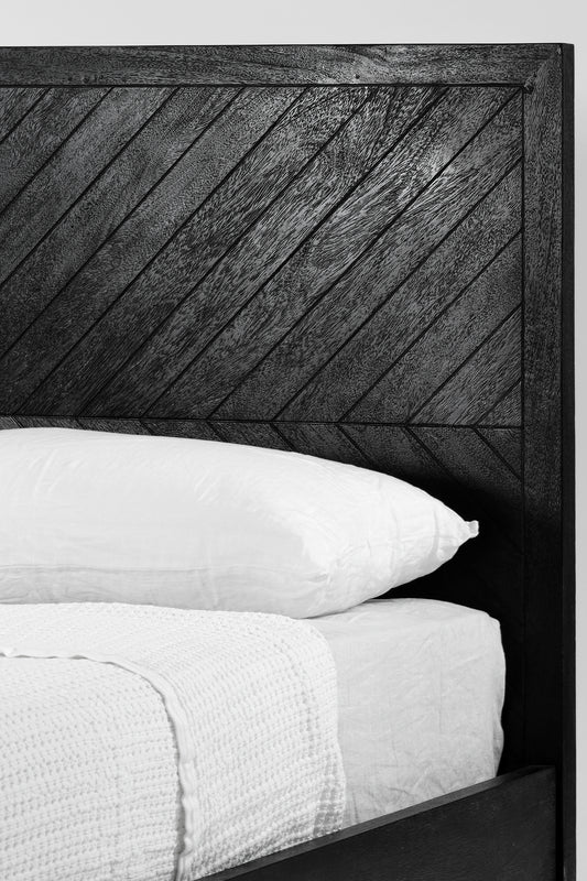 Made from solid mango wood, the Tapestry bed has an intricate herringbone inspired pattern on the bedhead and tapered legs.