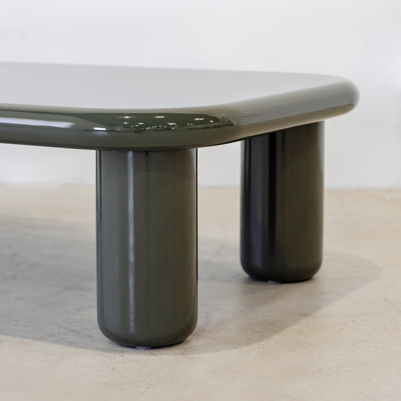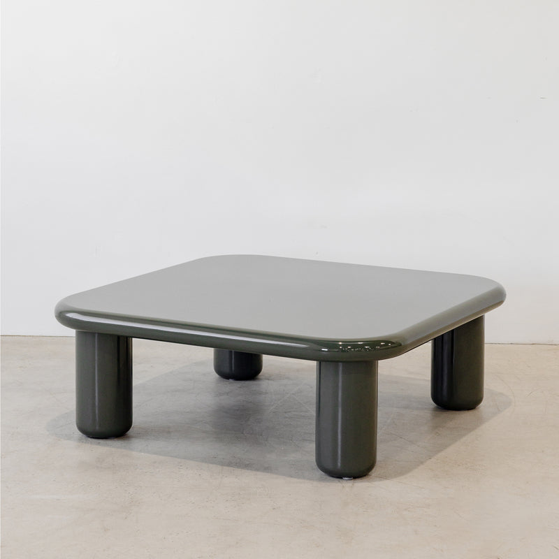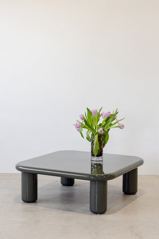 With its oversized form, soft-edged curves, and olive lacquered finish, this squared coffee table offers a quiet kind of luxury.