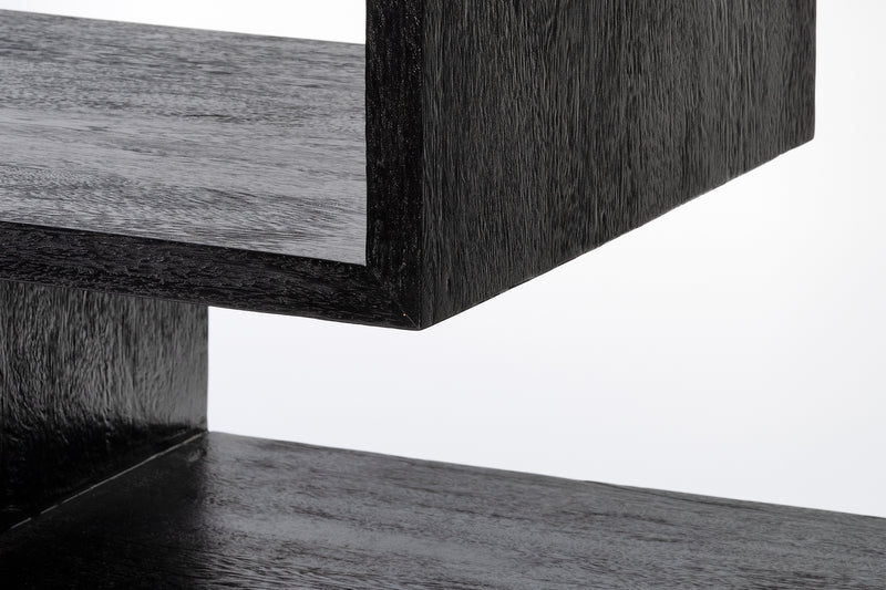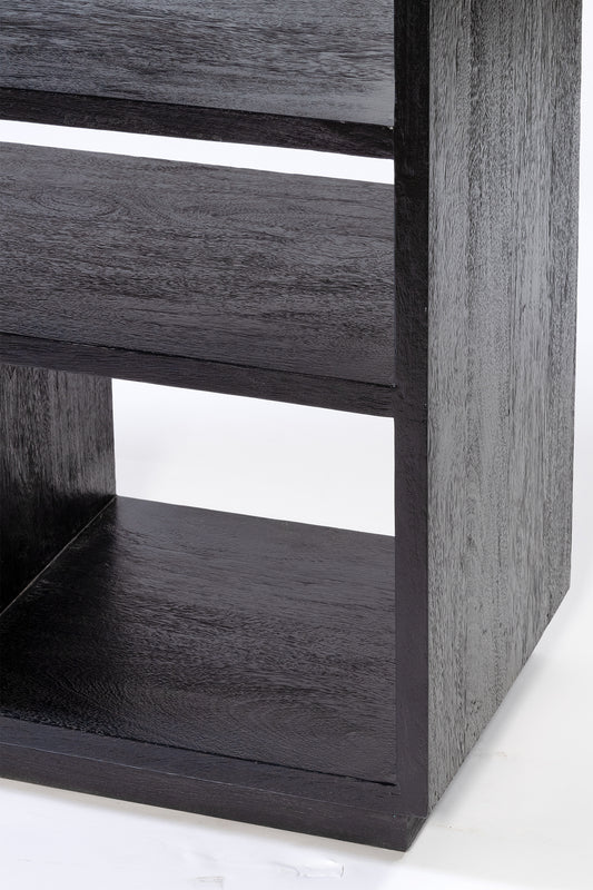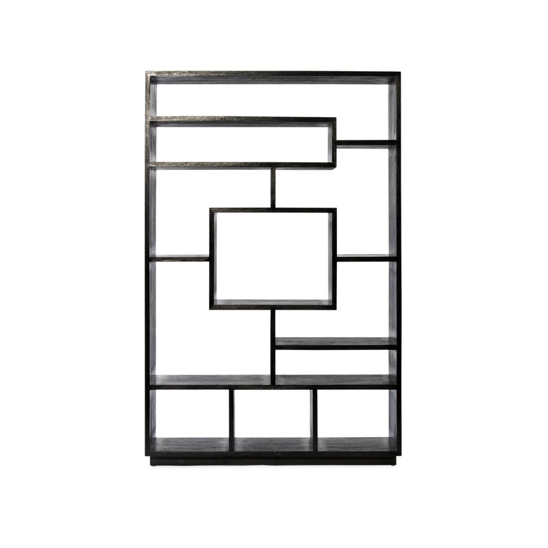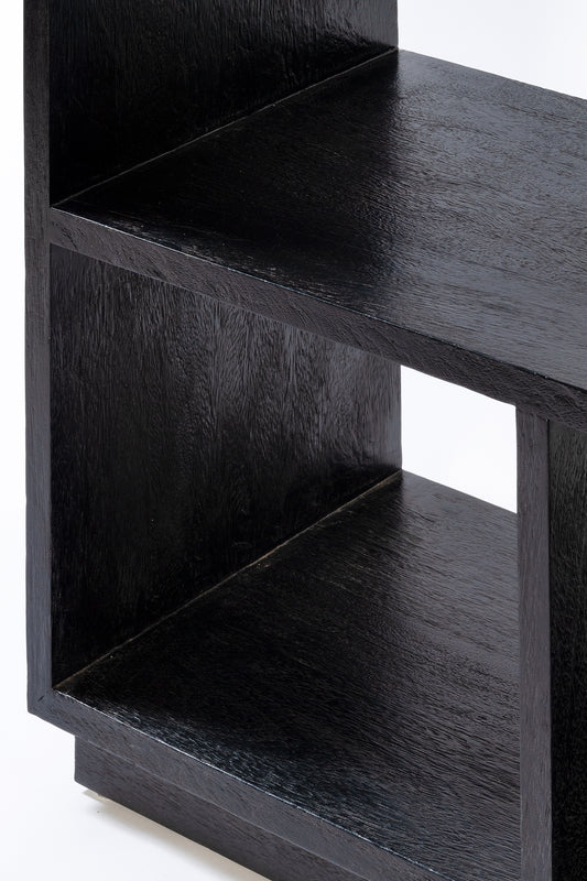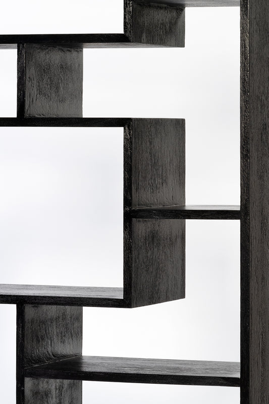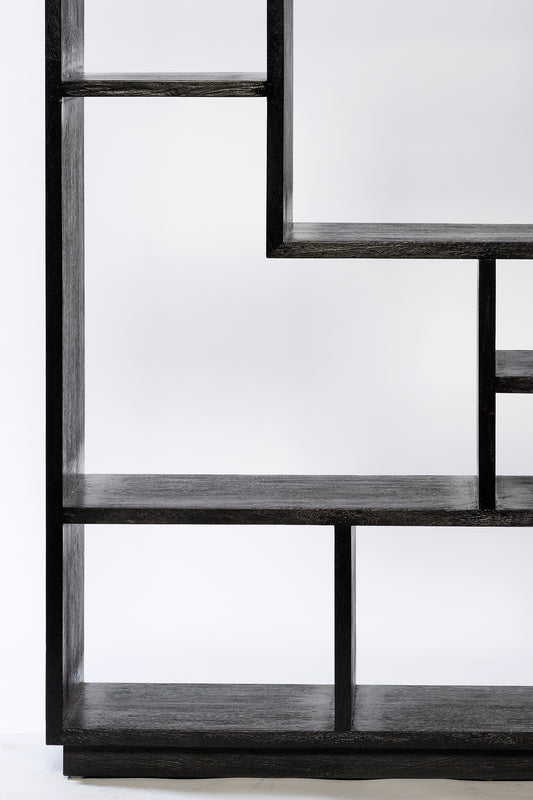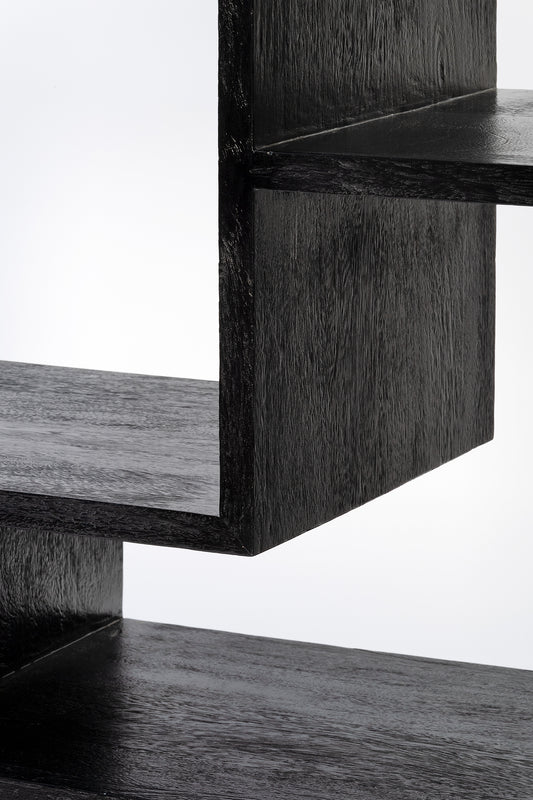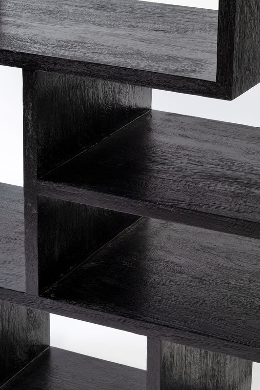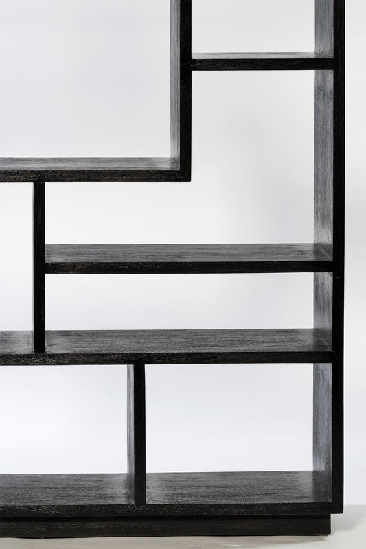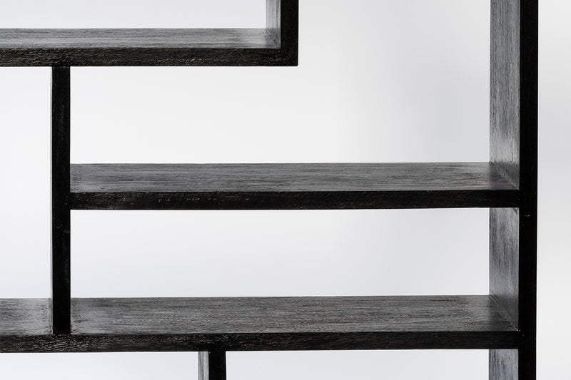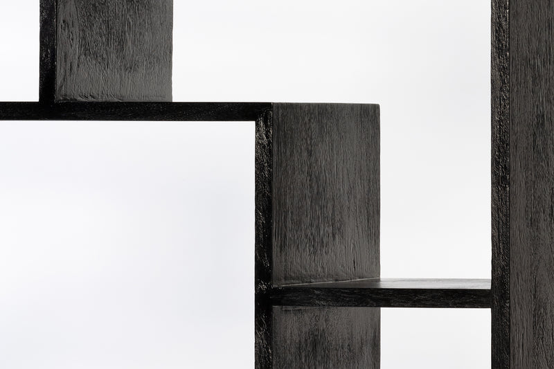 Built from solid mango wood in Black finish. Tall rectangle shaped with eleven open storage compartments of varying shapes and sizes. Also available in a small size.