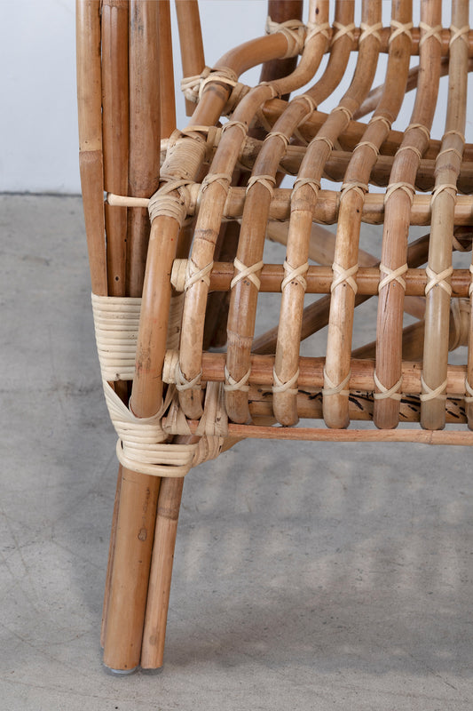 Handcrafted from rattan with distinctive curved weaving on the sides and back in a natural finish. Suggested for indoor use, alfresco and away from full weather elements.