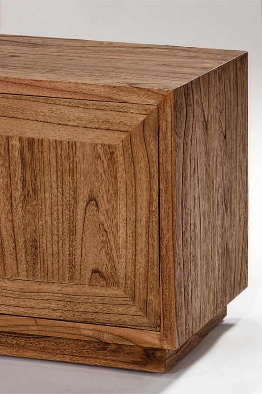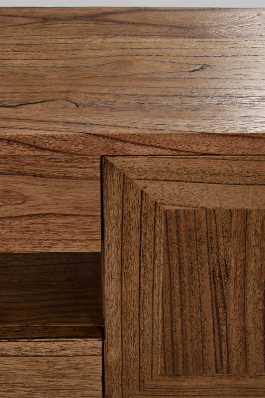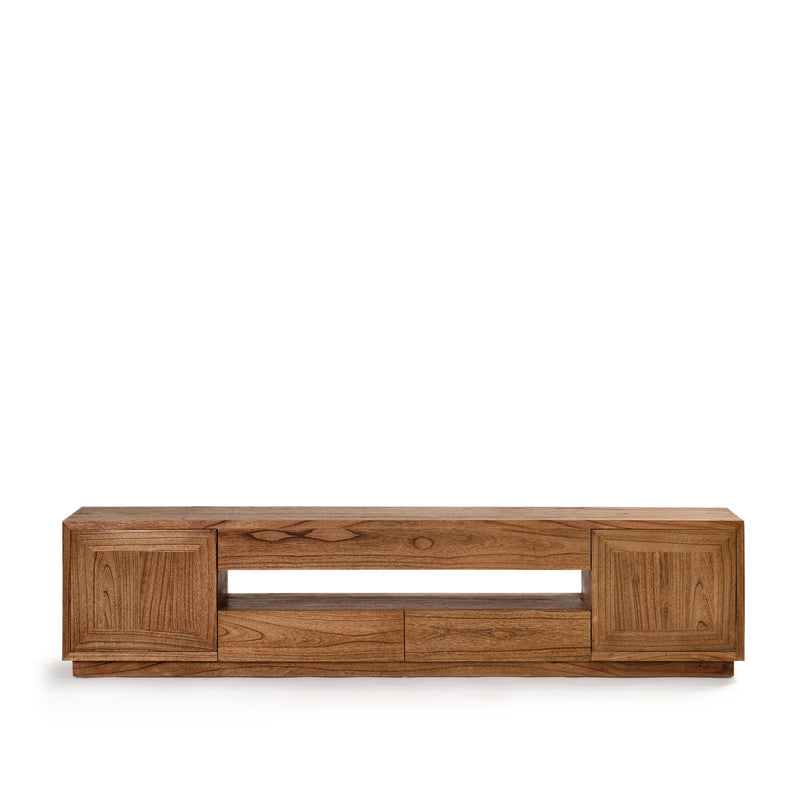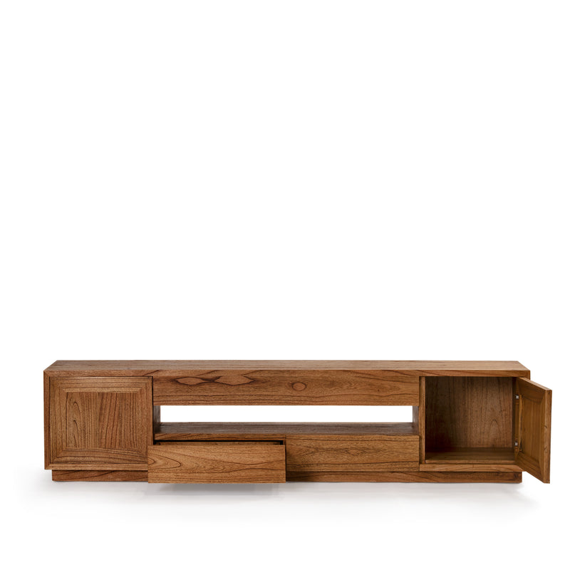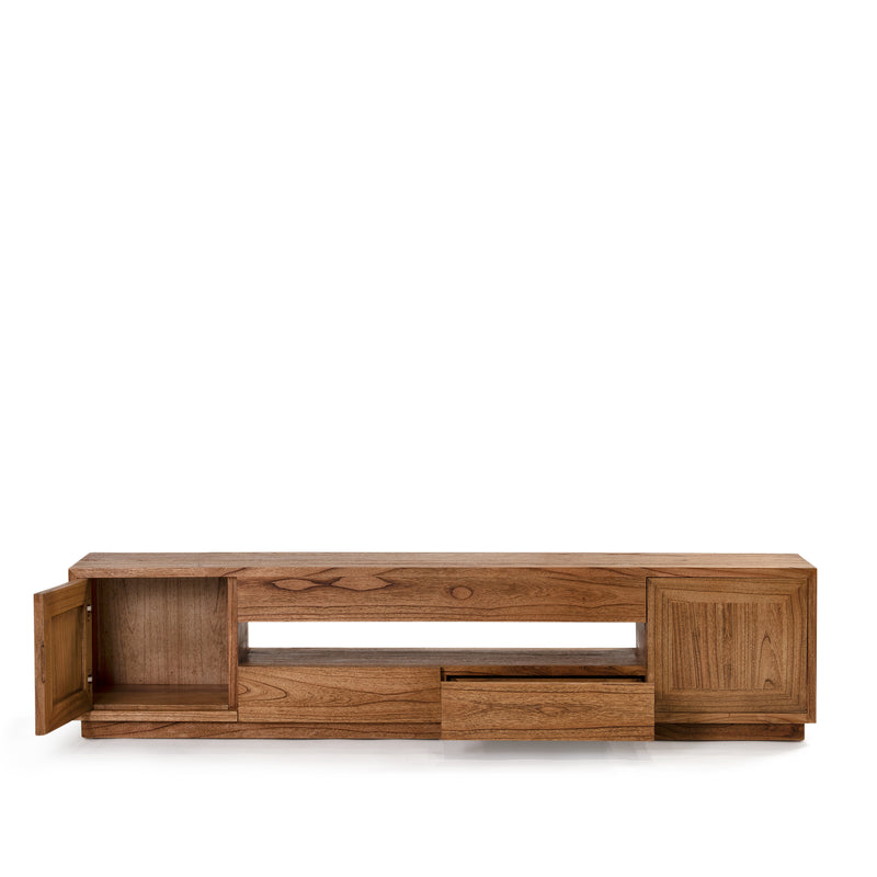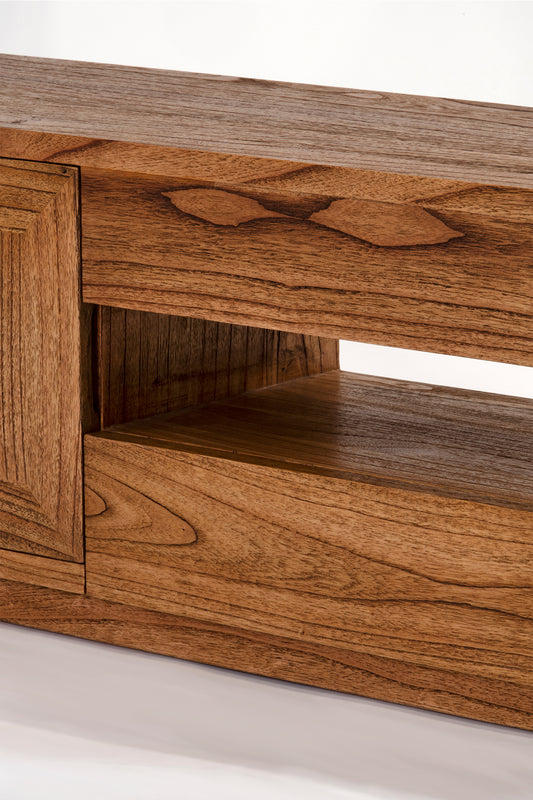 The Villa entertainment unit is made from mindi wood with an antique finish. It has two cupboards at either end and a hollow space in the middle separating the top two drawers from the two lower drawers.