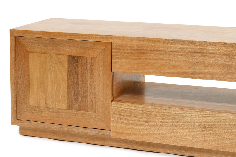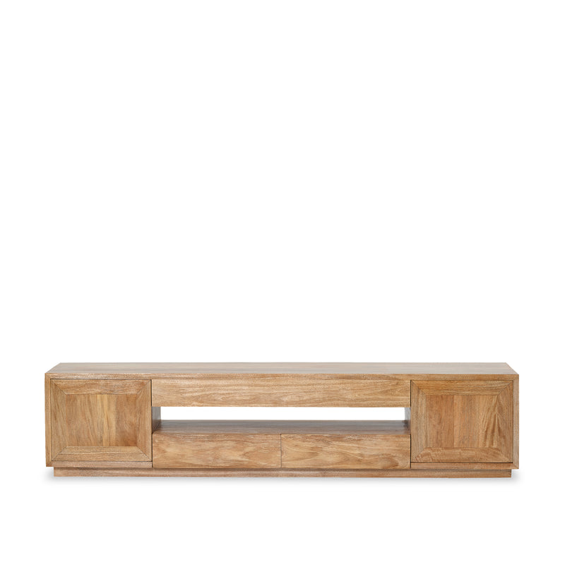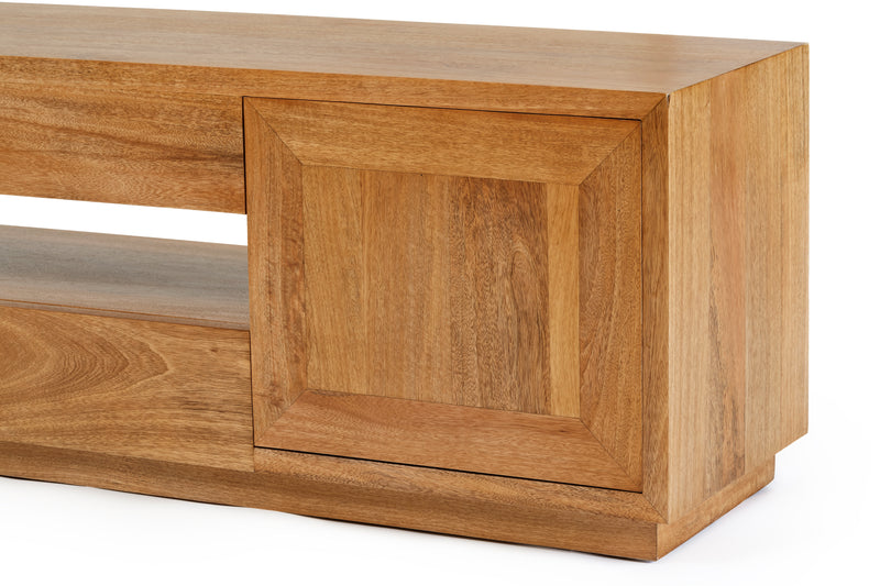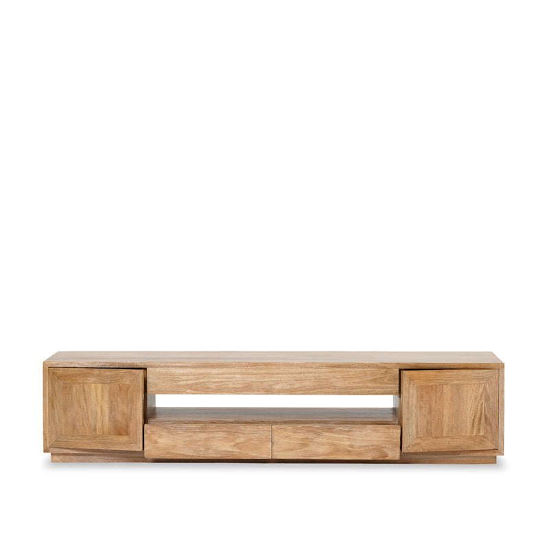 The Villa entertainment unit is made from mango wood with a Natural Sealed finish. It has two cupboards at either end and a hollow space in the middle separating the top two drawers from the two lower drawers.