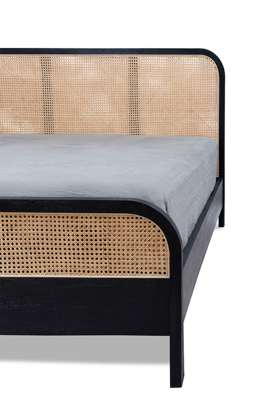 - Solid mango wood in black finish with natural rattan insert.