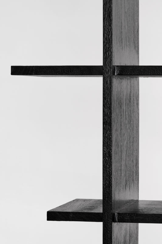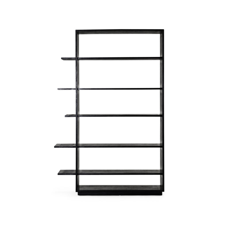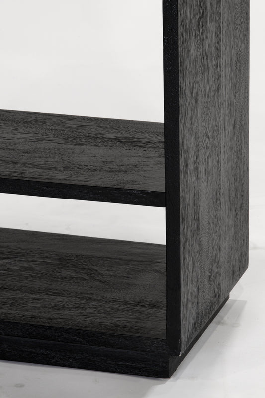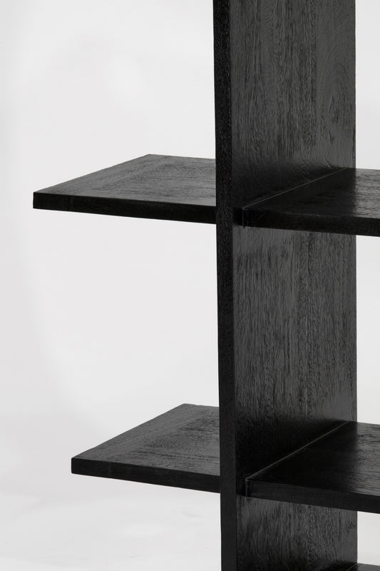 Built from solid mango wood in a black finish. Six shelf storage unit with five open shelves extending off the side of the bookcase.