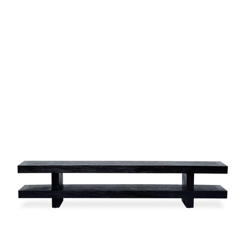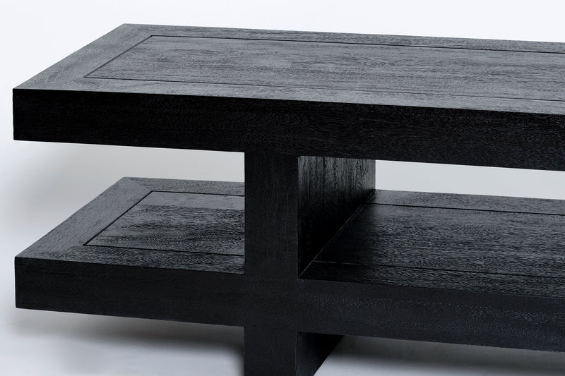 Made from mango wood in a Black finish, the Zen entertainment unit has two long flat open surfaces joined by solid straight legs on both ends for maximum support.